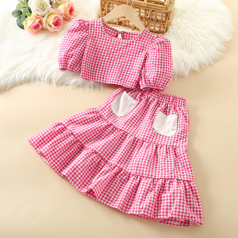 Kids Girls Plaid Print Puff Sleeve Blouse & Pocket Skirt Set Wholesale