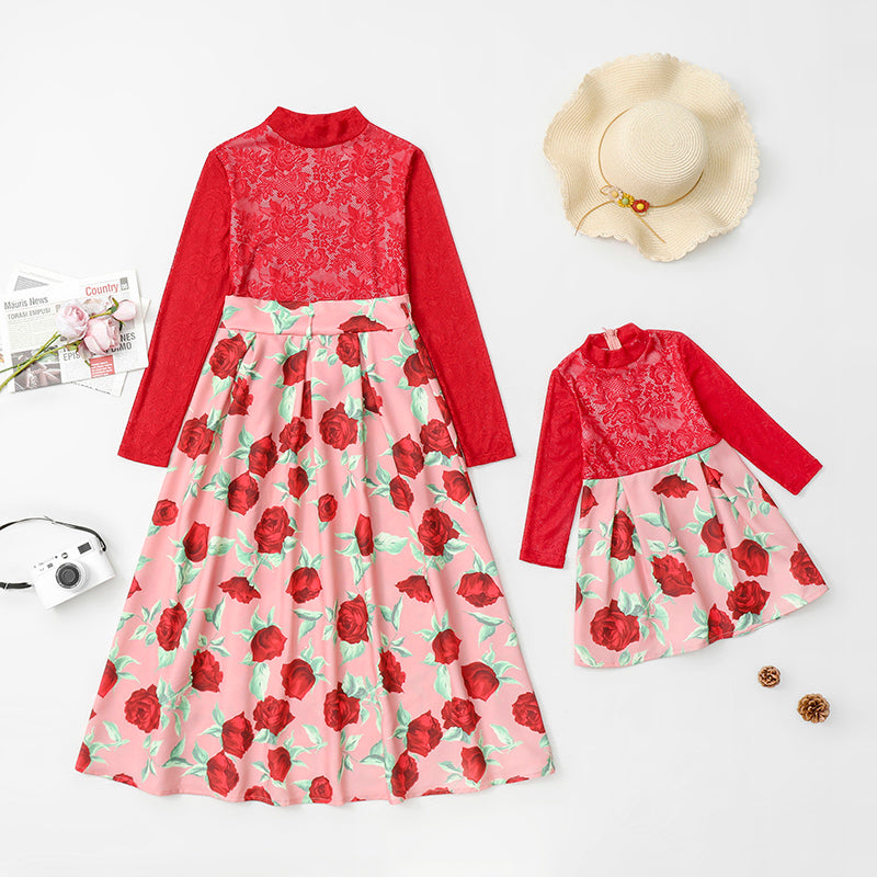 Red Lace Long Sleeve Rose Printing Suit Mother Baby Clothes Wholesale
