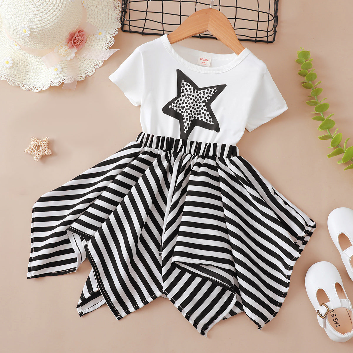 Toddler Girl Cute Cool Pentagram Striped Asymmetric A line Dress Wholesale