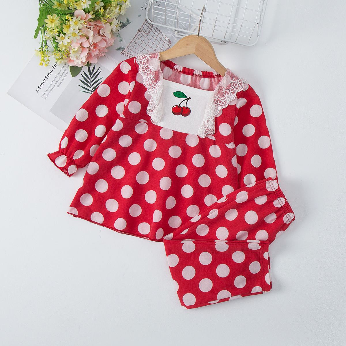 Toddler Girls Cotton Polka Dot Color-block Top & Pants Pajamas Sets Wholesale