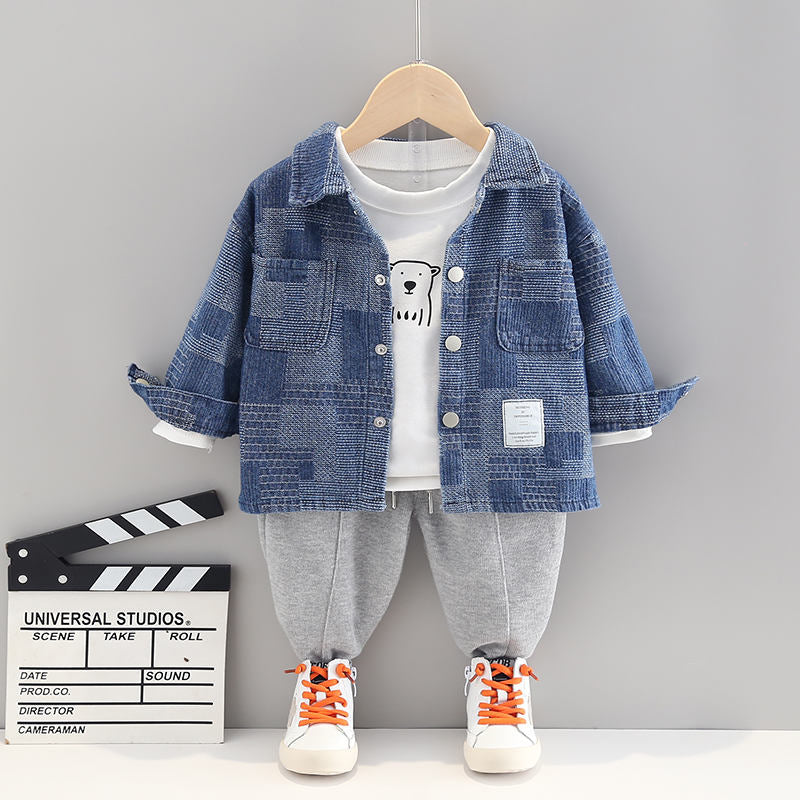 Toddler Boy Bear Pattern T-shirt & Plaid Print Coat & Pants Wholesale