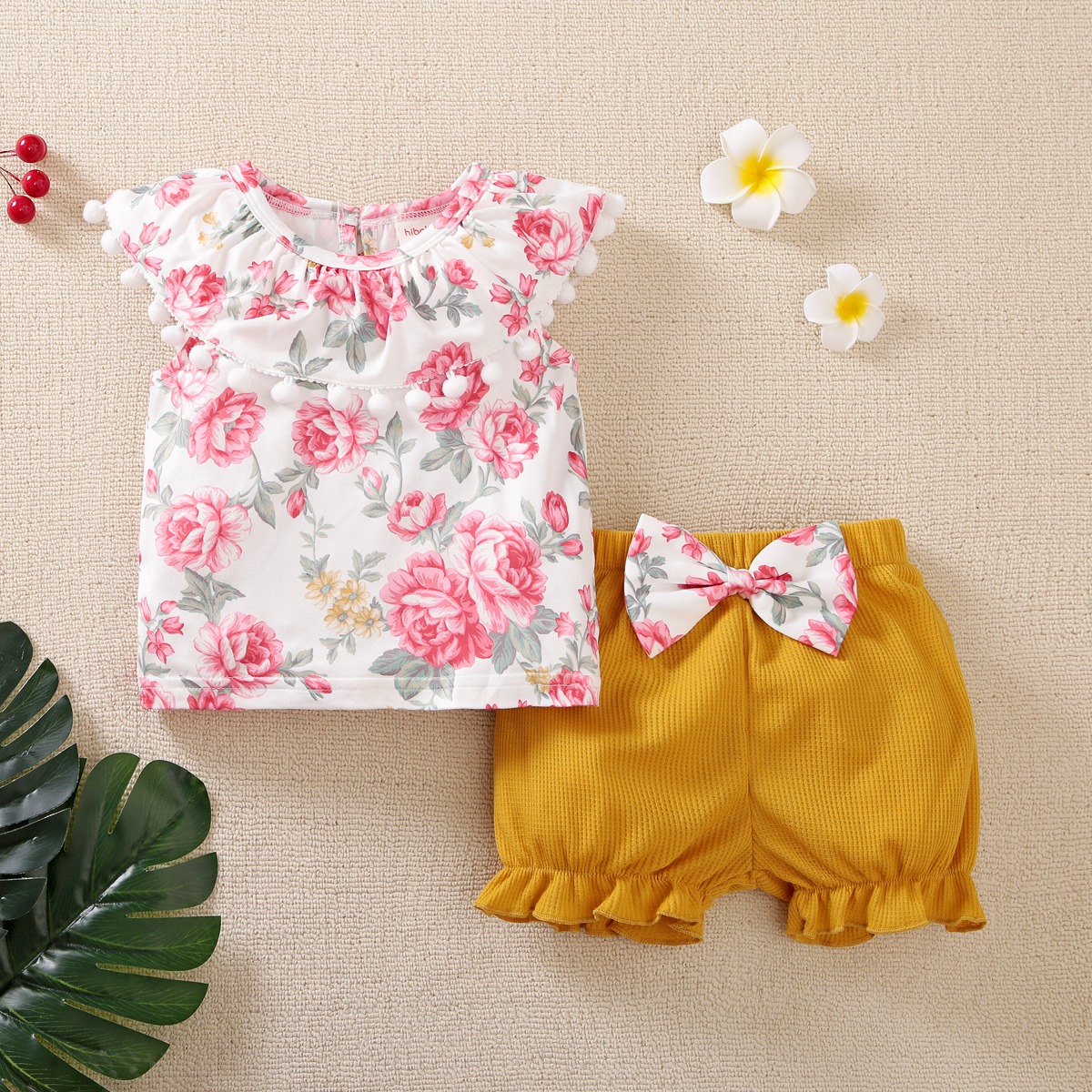 Toddler girl 2-Piece Floral Ruffled Top and Solid Belted Shorts Wholesale