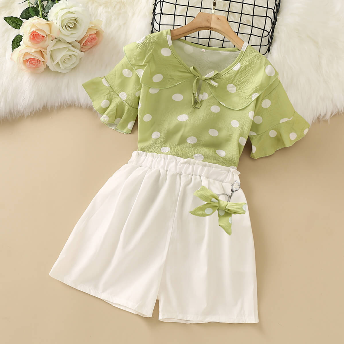 Kid Girl Dot Print Short Ruffled Top & pant Suit Wholesale
