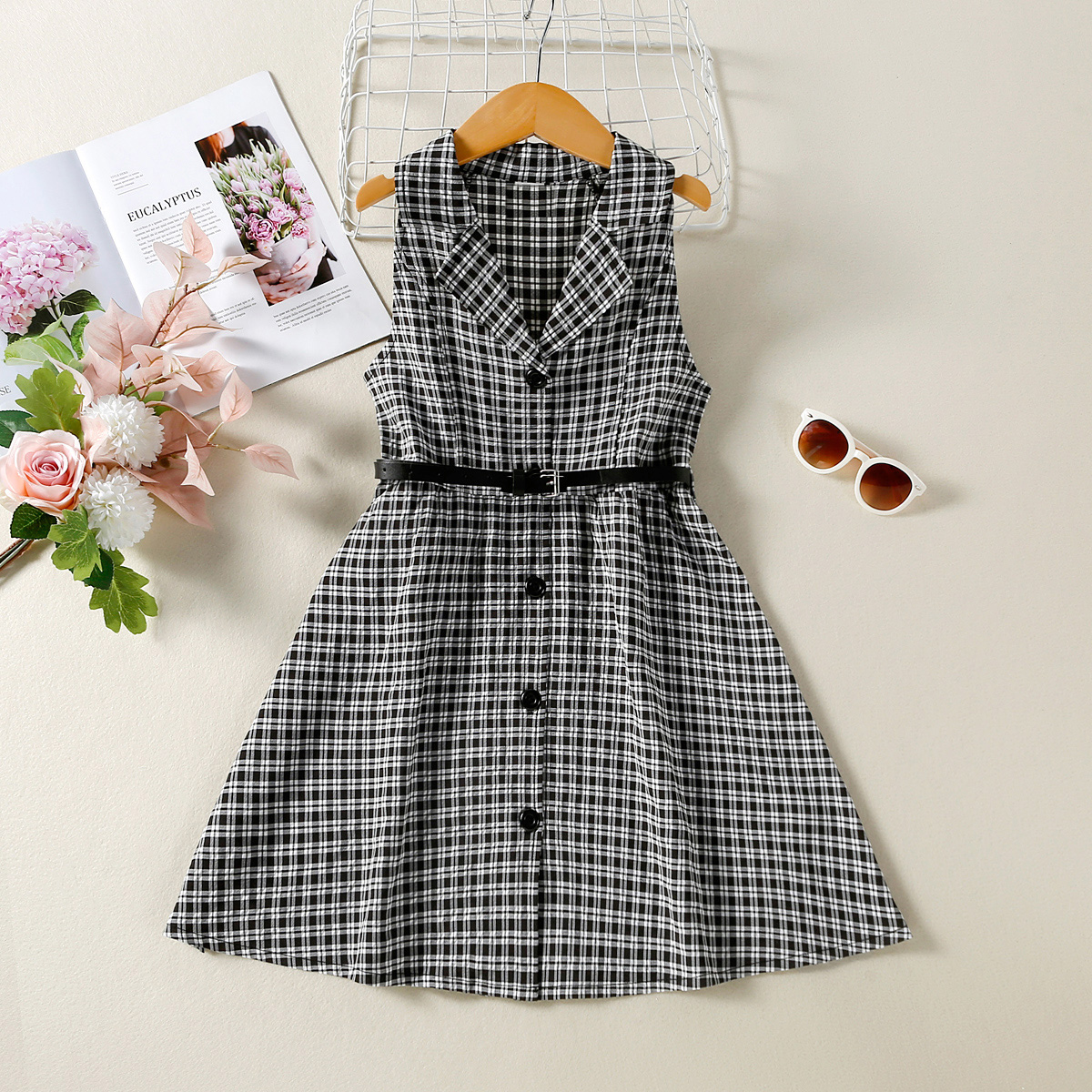 Kids Girls Personality Retro Black and White Plaid Sleeveless Lapel A-line skirt Wholesale