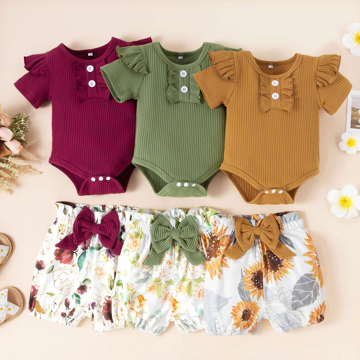 Baby Girl Solid Color Bodysuit & Floral Bow-knot Shorts Wholesale