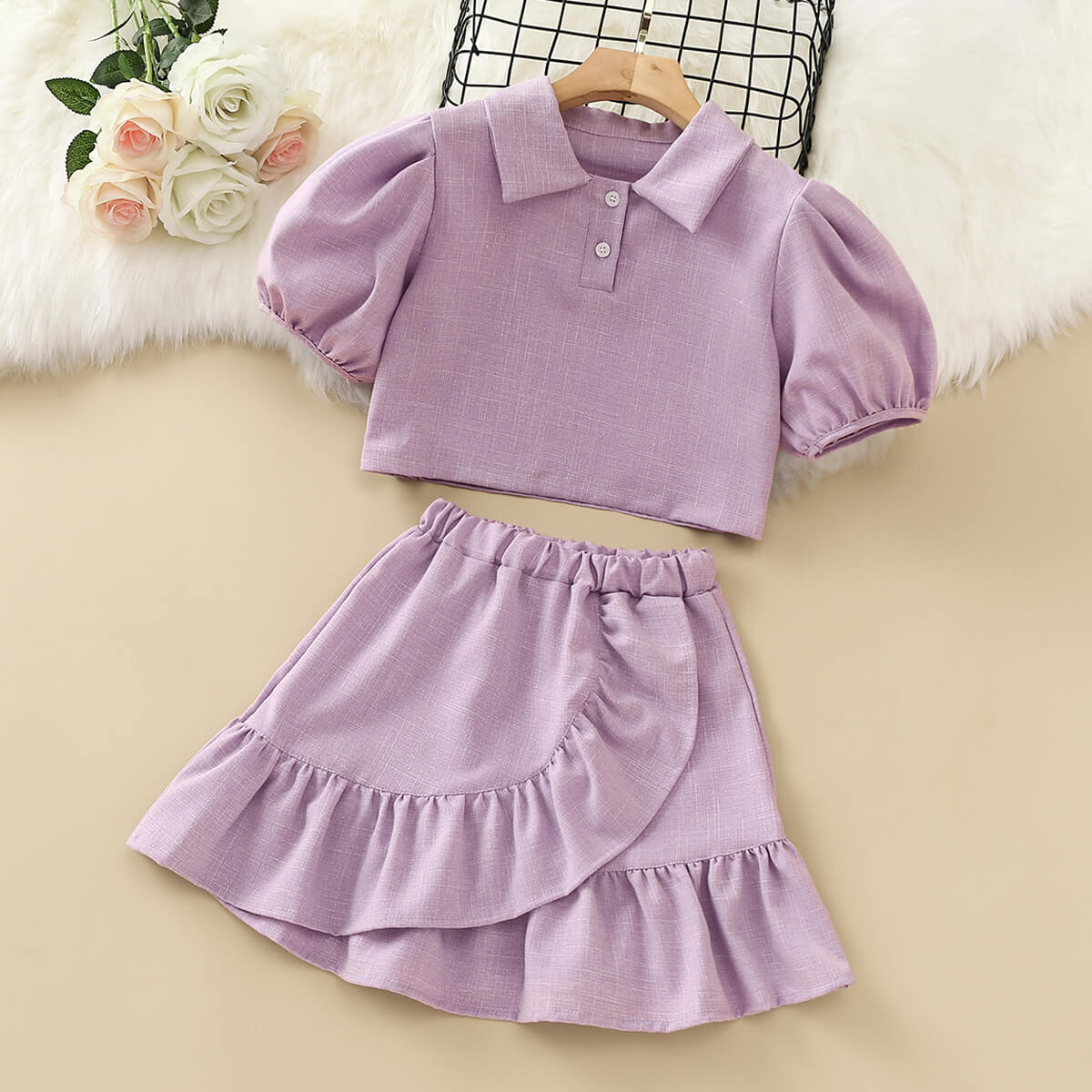 Kids Girls Grace Puff Sleeve Polo Collar Short&Lace Skirt Suit Wholesale