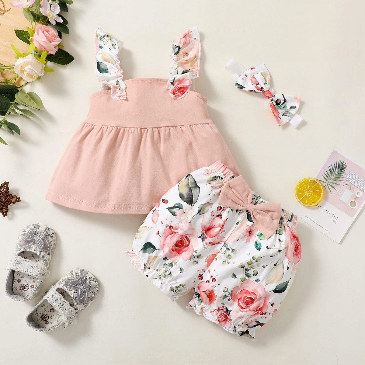 Baby Girl Sweet Solid Sleeveless Top And Floral Shorts with Headband Wholesale