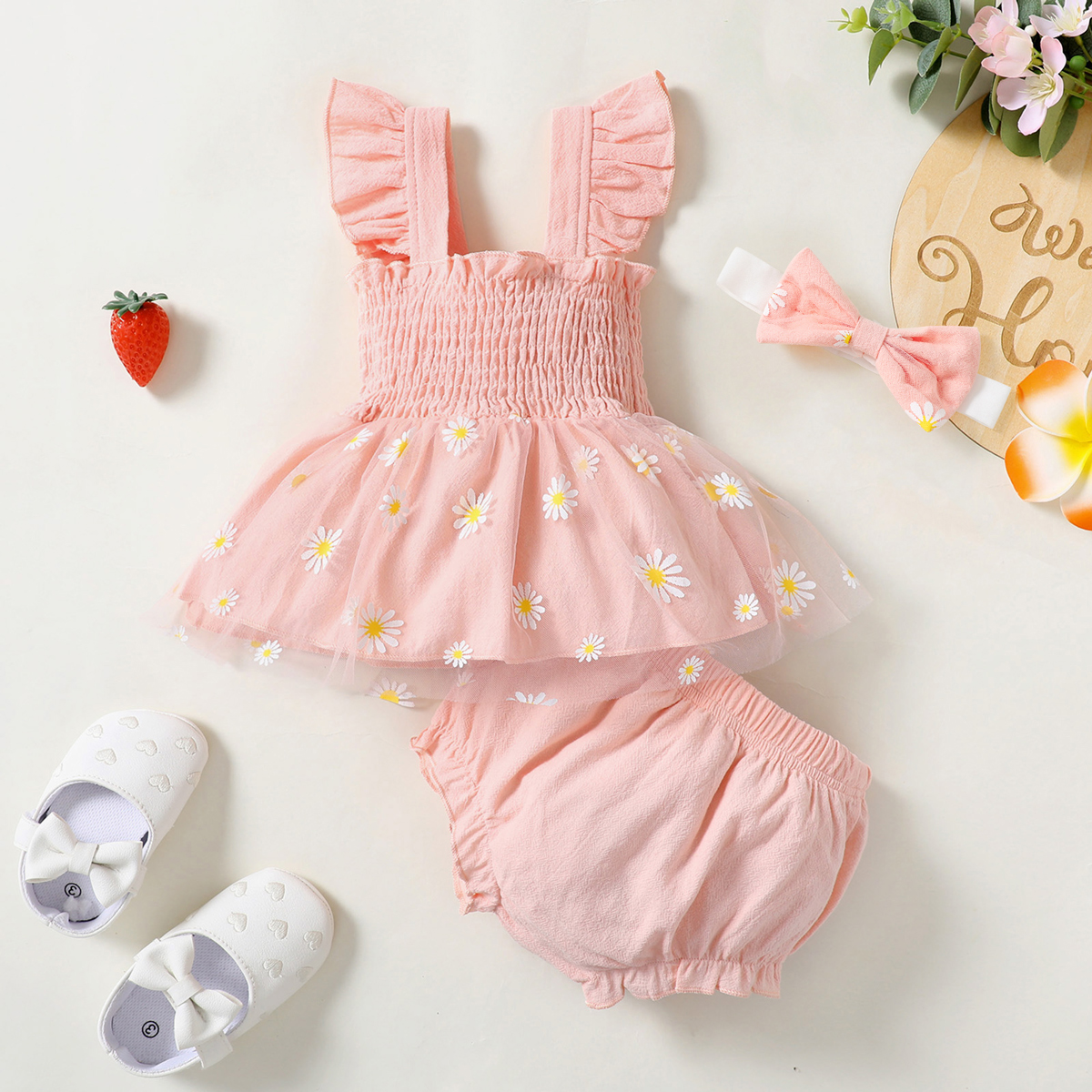 Baby Girl Beautiful Smocking Ruffle-sleeve Top And Shorts with Headband Wholesale