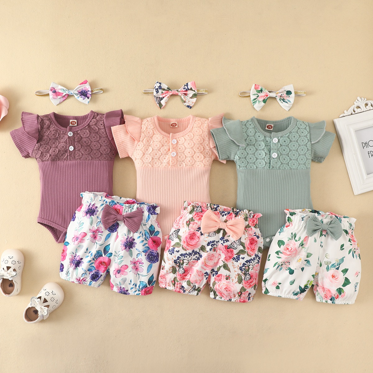 Baby Girl Sweet Hollow out Lace Bodysuit And Floral Shorts with Headband Wholesale