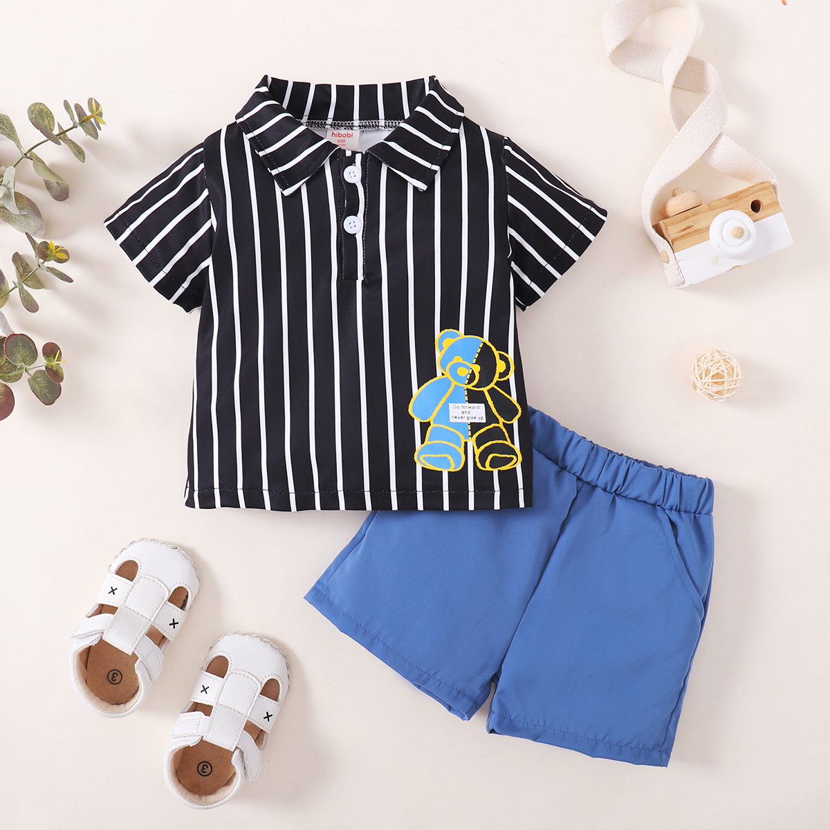 Toddler Boy Cotton Cartoon Stripes Solid Bear Top & Shorts Wholesale