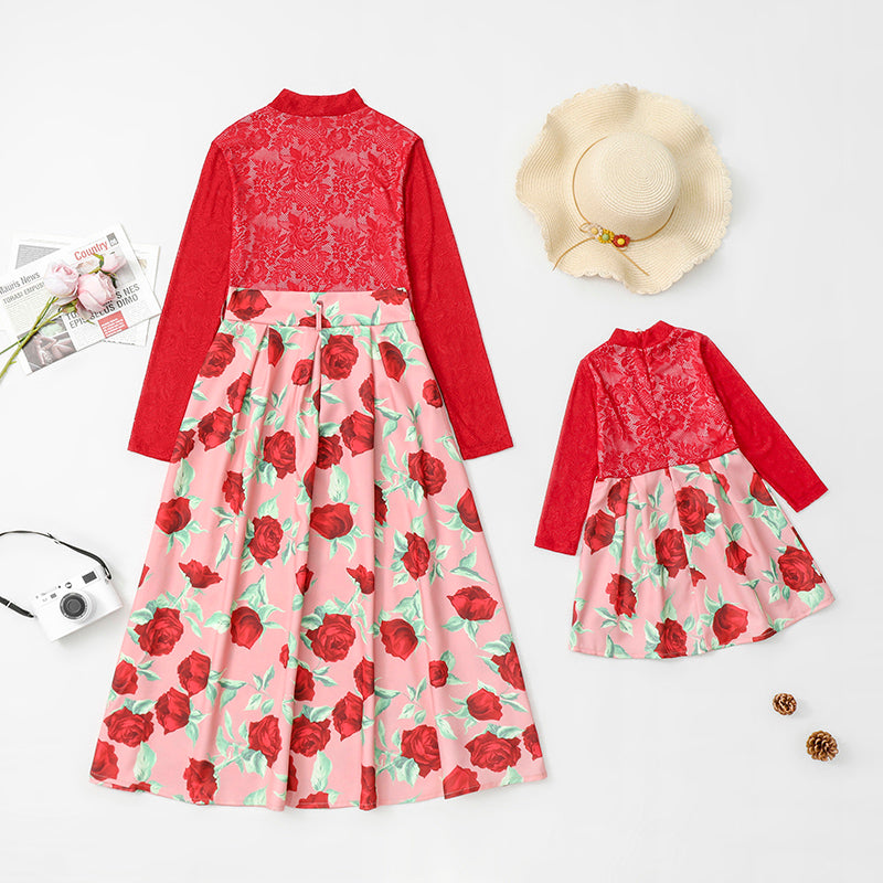Red Lace Long Sleeve Rose Printing Suit Mother Baby Clothes Wholesale