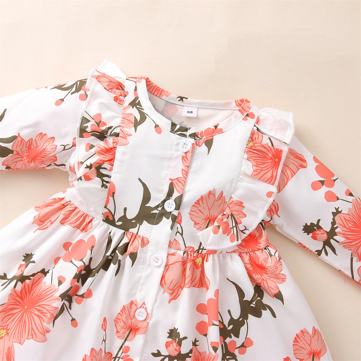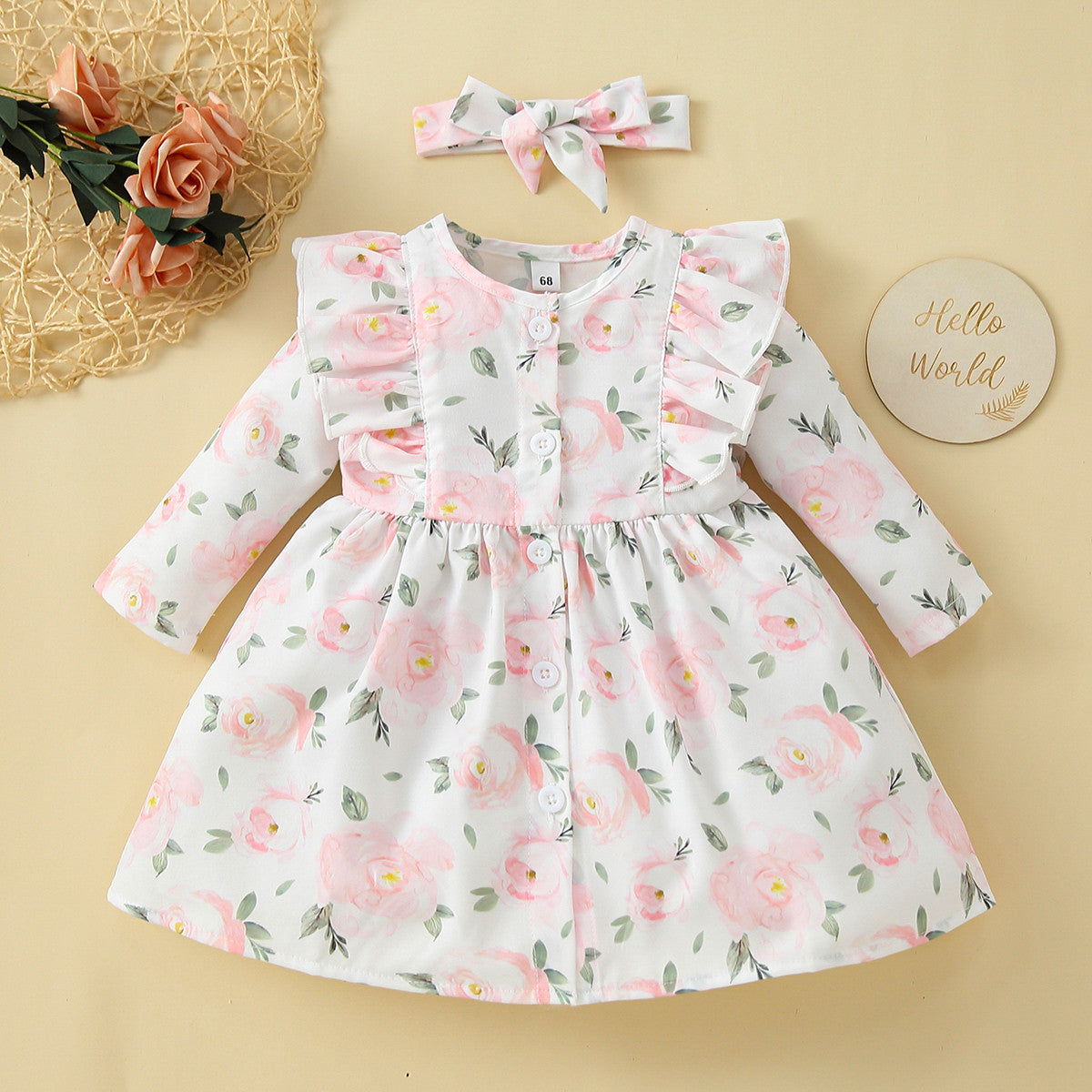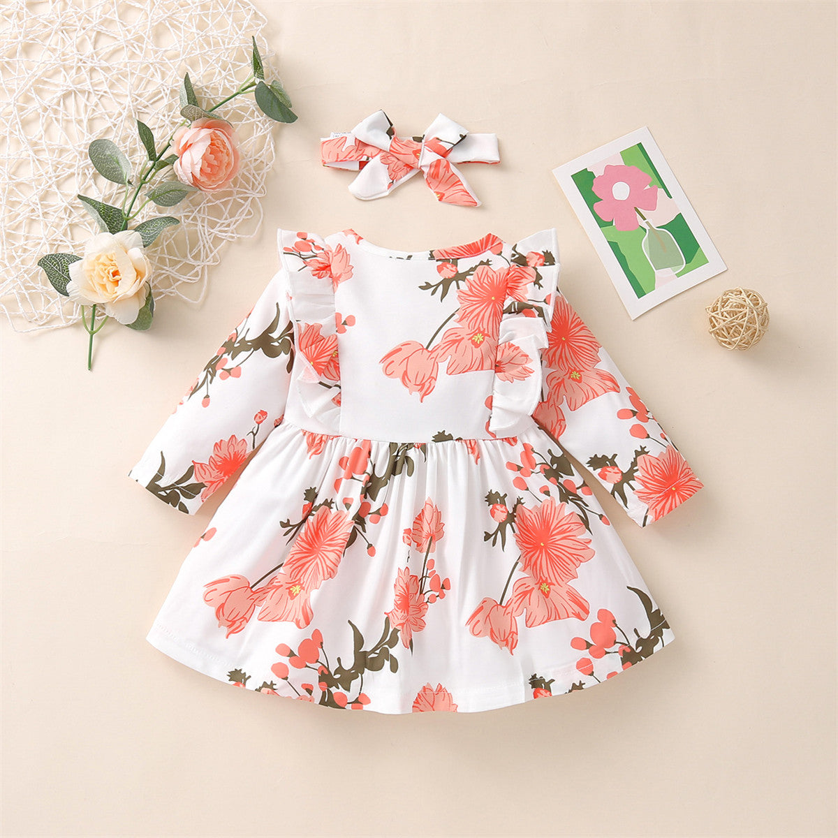 Baby Girl Sweet Floral Print Ruffle Long Sleeve Dress Headband Two-piece Wholesale