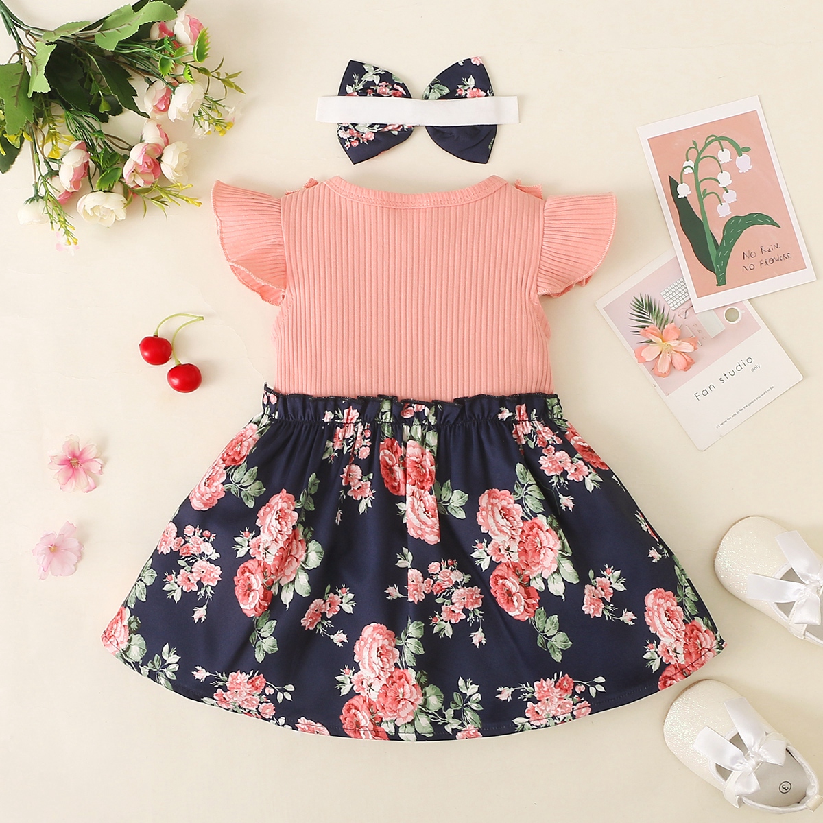 Baby Girl Sweet Floral Print Color-block Dress with Headband Wholesale