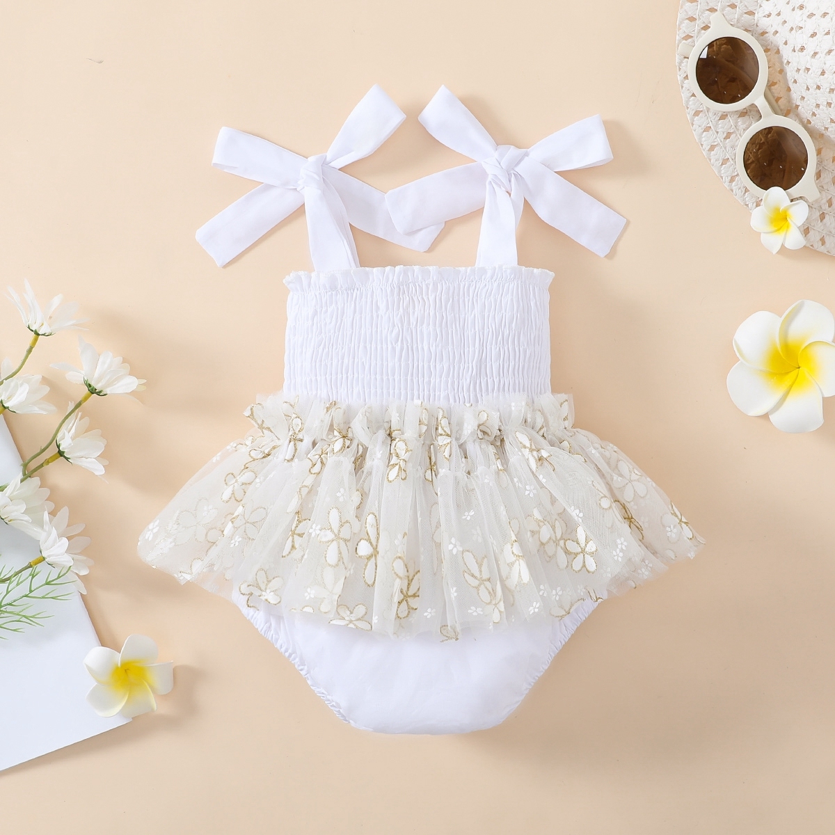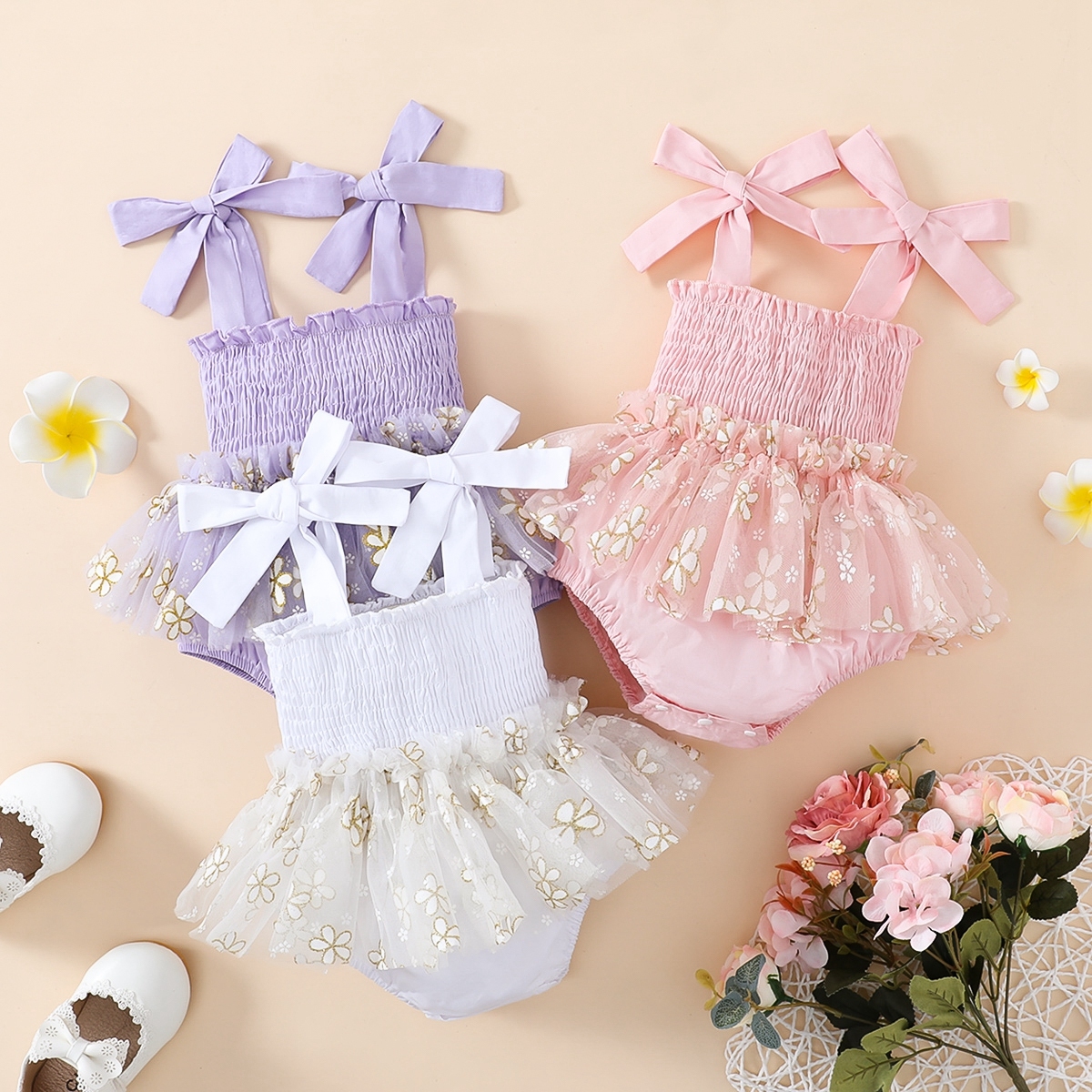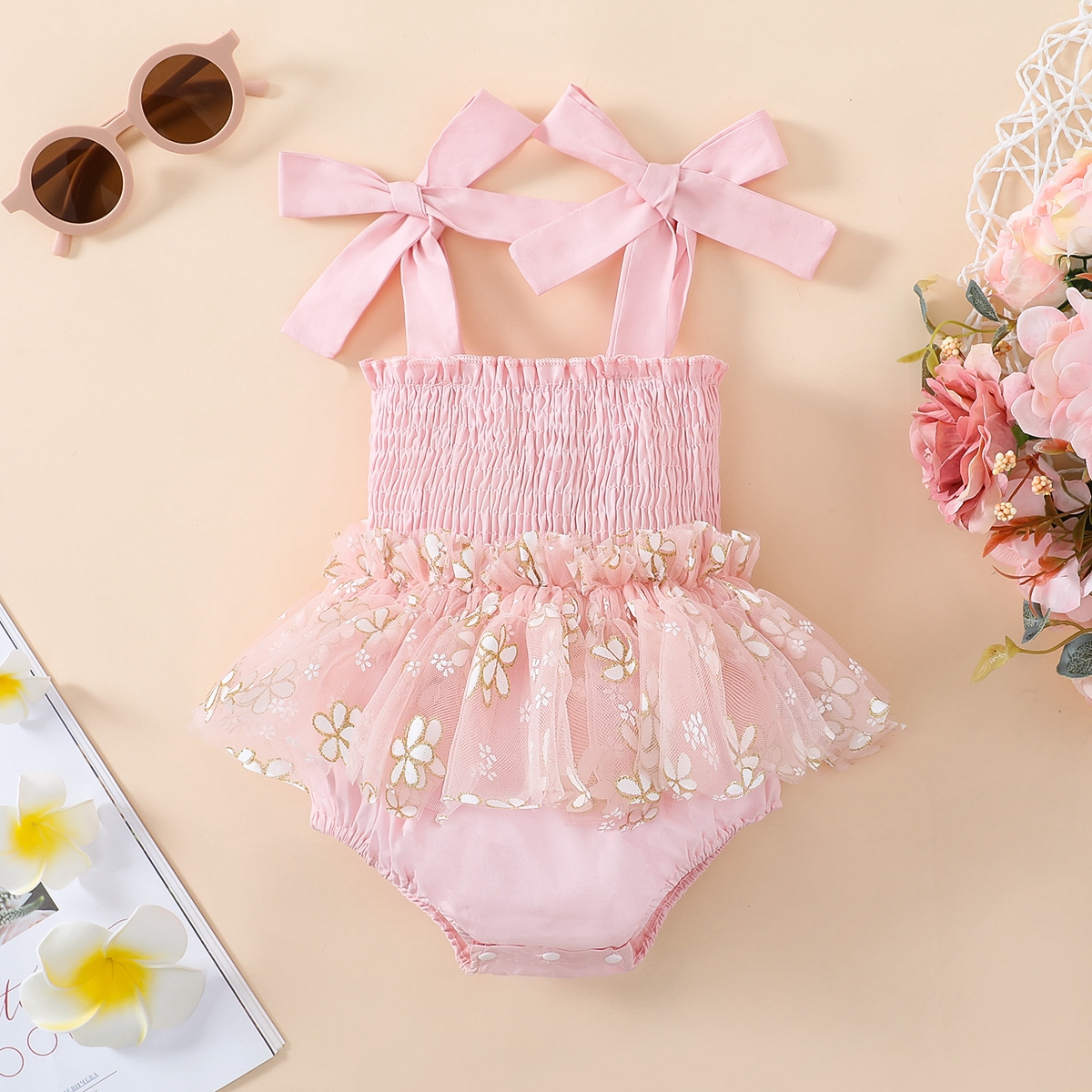 Baby Girl Floral Pattern Mesh Bow-knot Decor Dress Bodysuit Wholesale