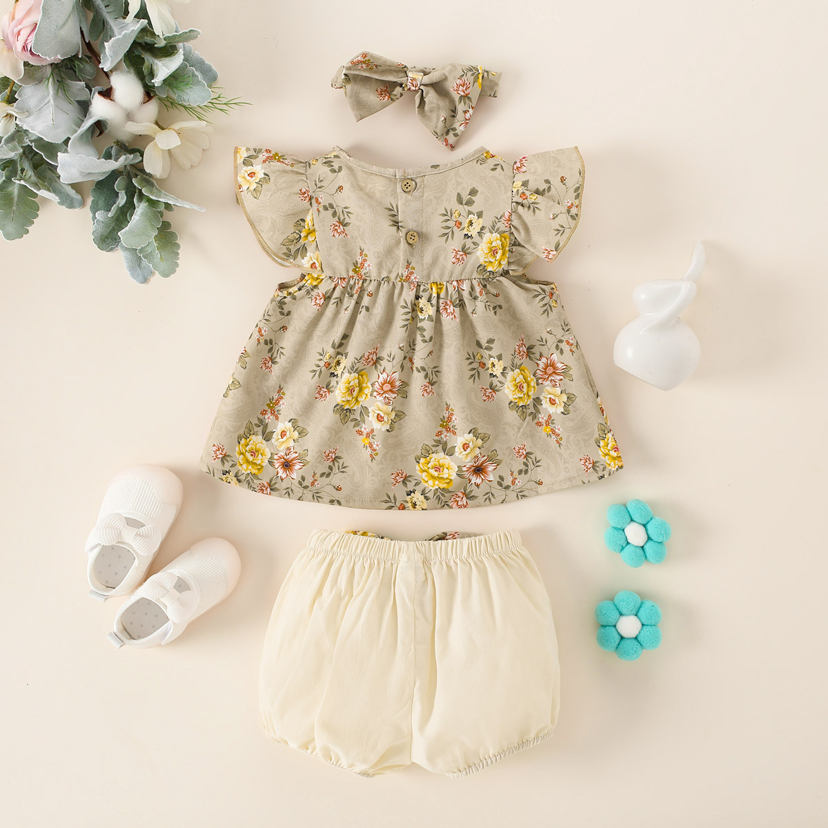 hibobi Girl Baby Floral Print Bow Fly Sleeve Set & Headband Wholesale