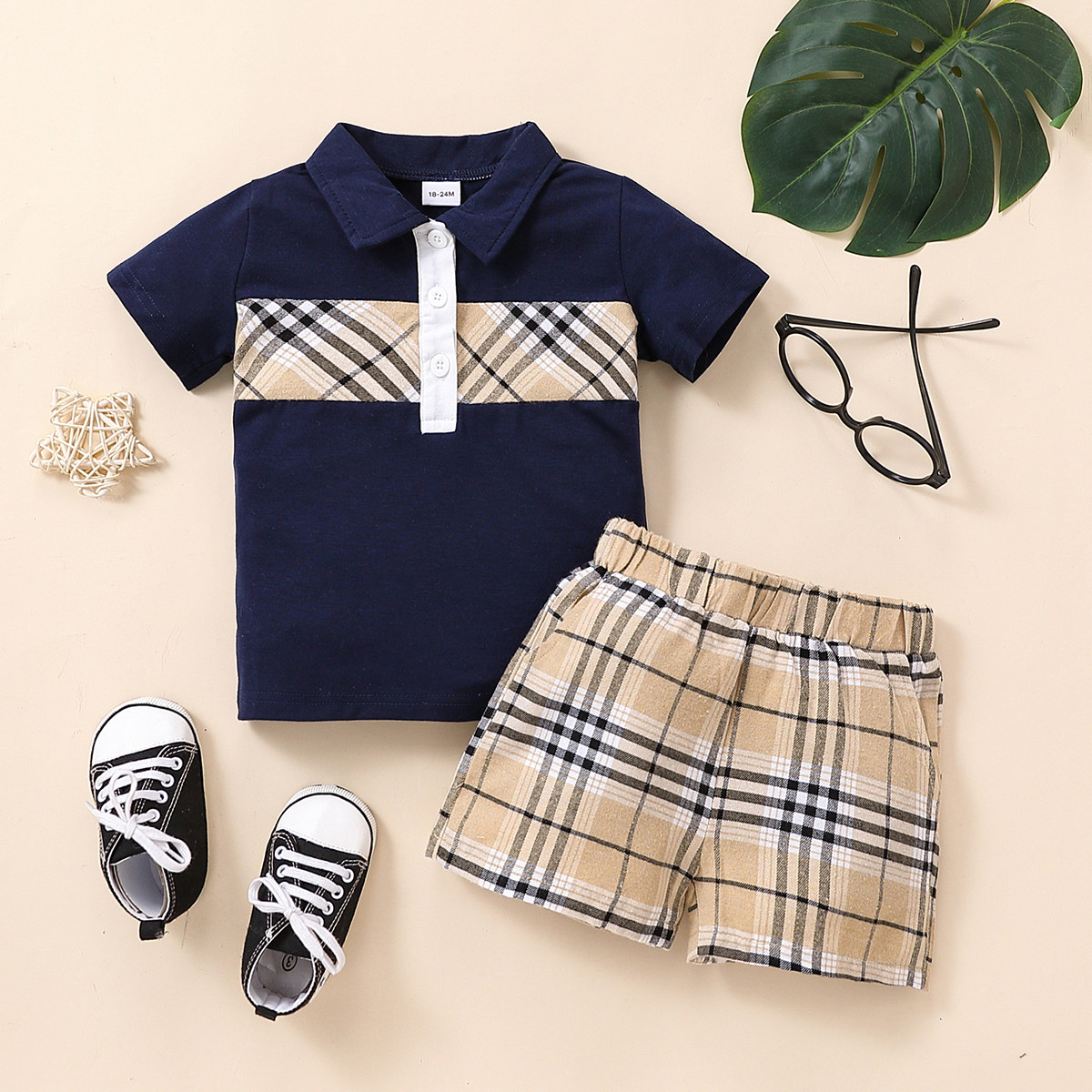 Toddler Boy Plaid Single-breasted Polo Collar Top & Shorts Wholesale