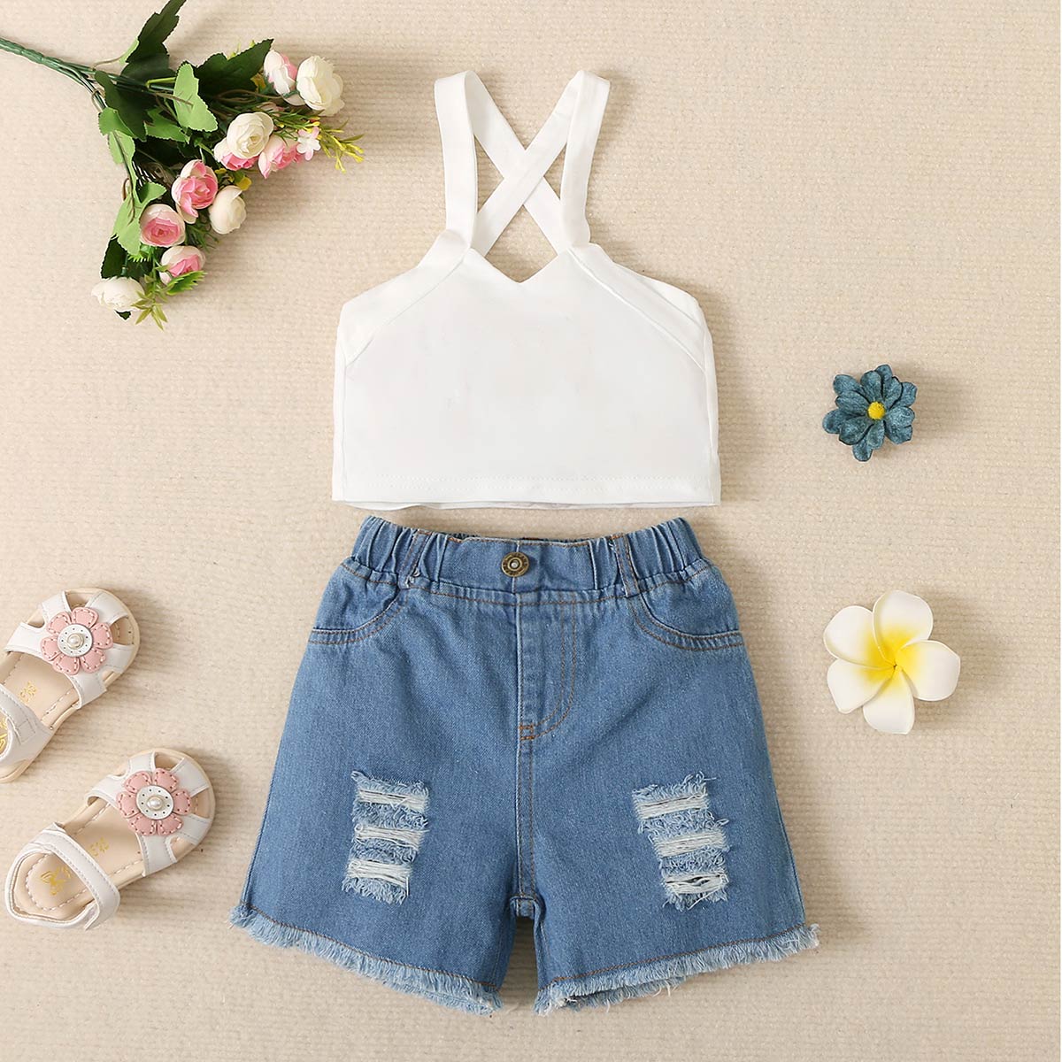 Toddler Girls Halter Neck Solid Top & Denim Shorts Wholesale