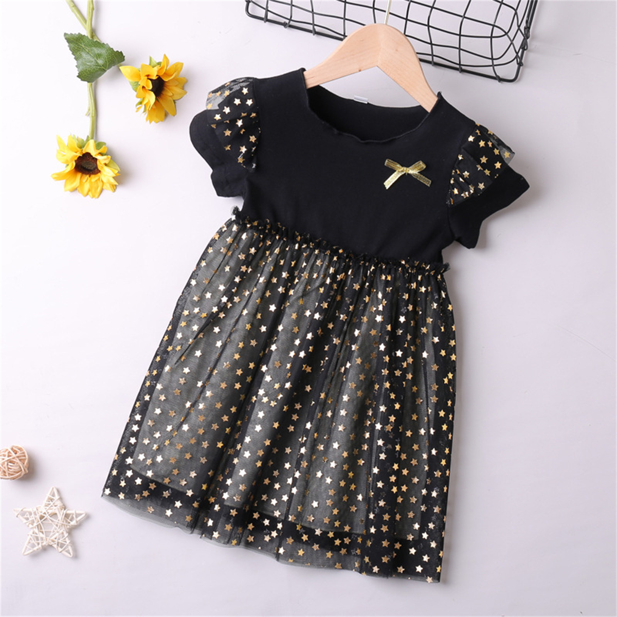 Toddler Girls Butterfly Sleeve Solid Pentagram Print Mesh Dress Wholesale