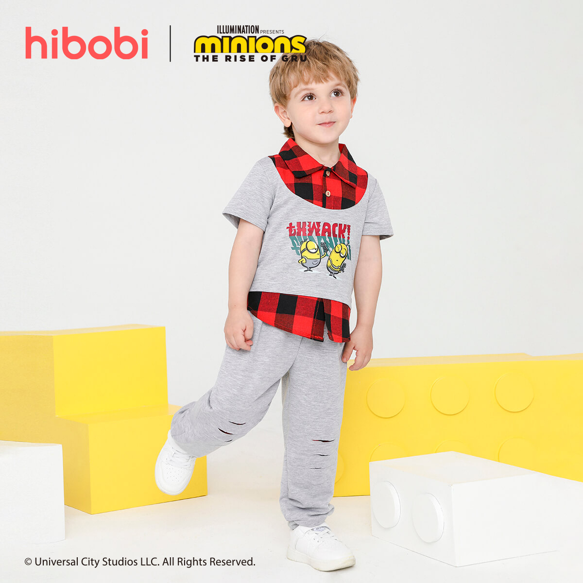 Minions ×toddler boy Printed Fake Two Piece Short Sleeve Grey Trousers Set Wholesale