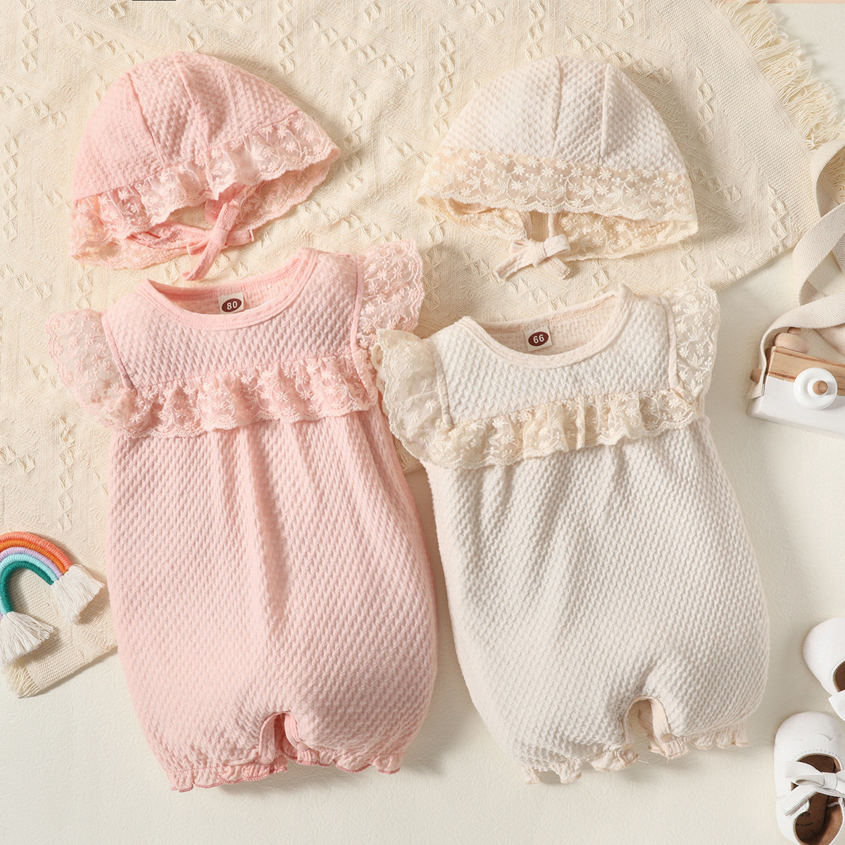 Baby Girl Solid Color Ruffle Lace Decor Romper & Sunhat Wholesale