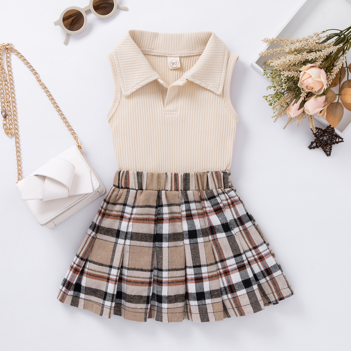 Toddler Girls Polo Collar Plaid Color-block Top & Skirt Dress Set Wholesale