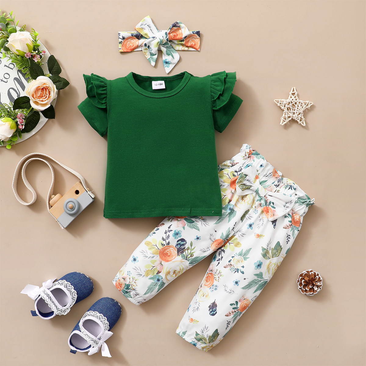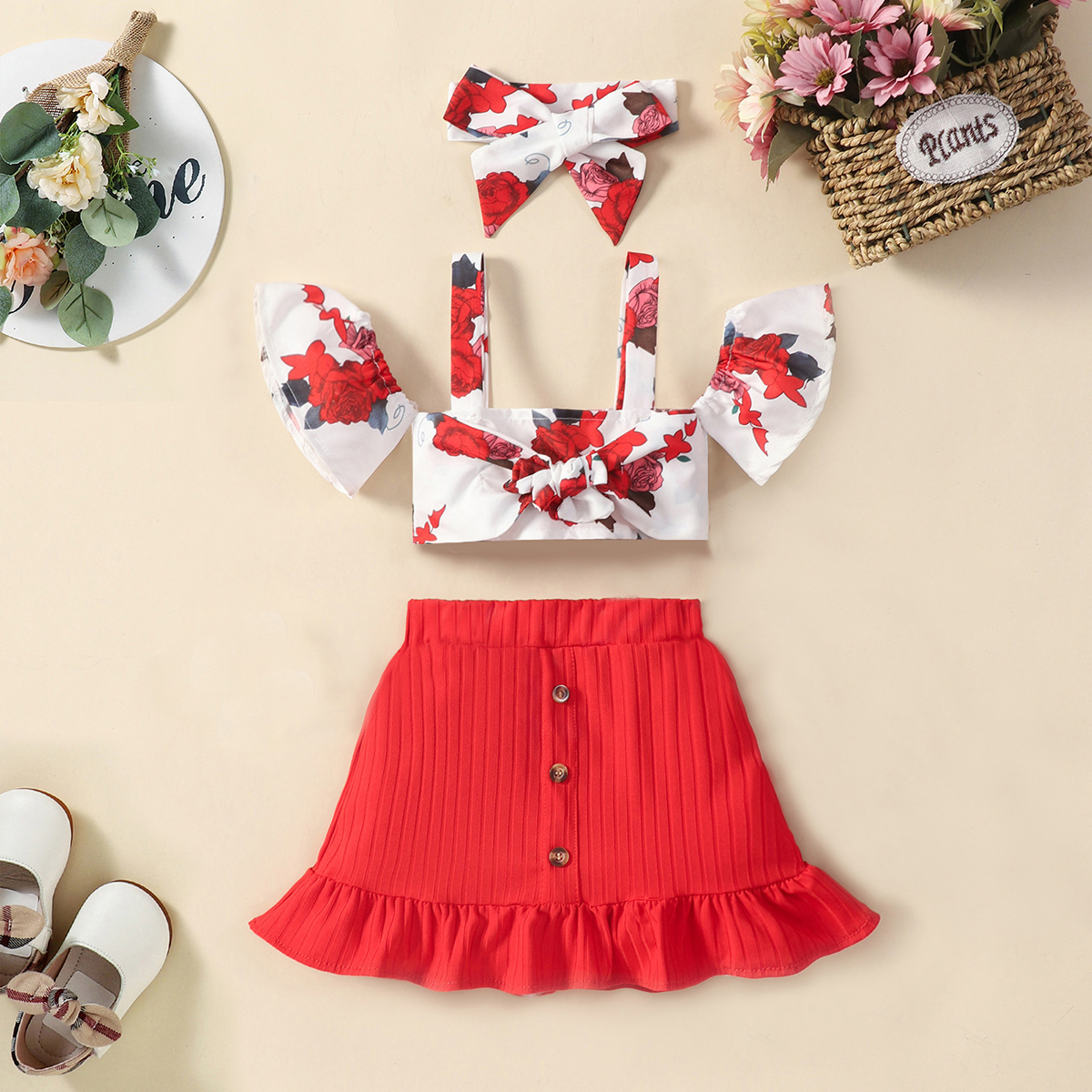 Toddler Girl Sweet Floral Ruffle Tank Top & Skirt & Hair Band Wholesale