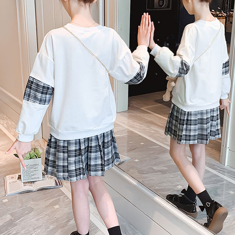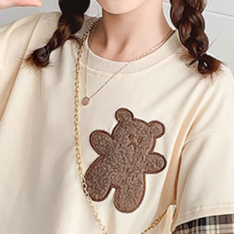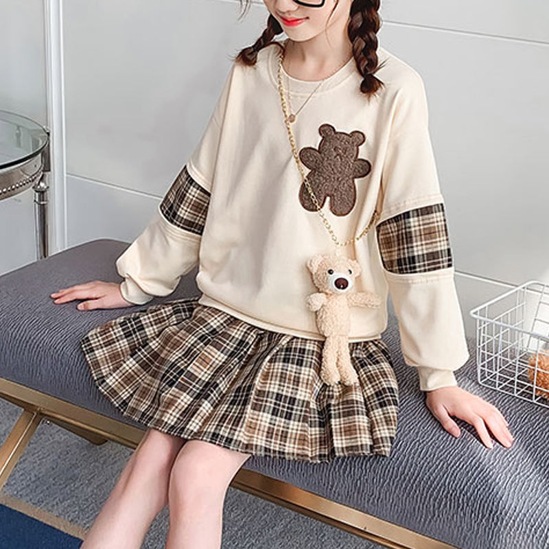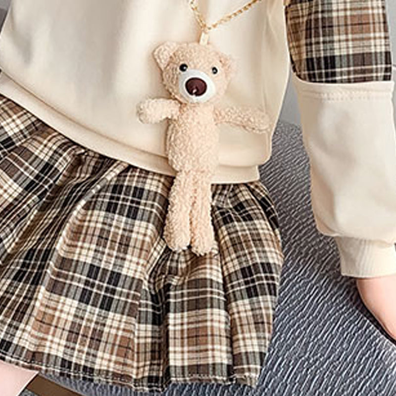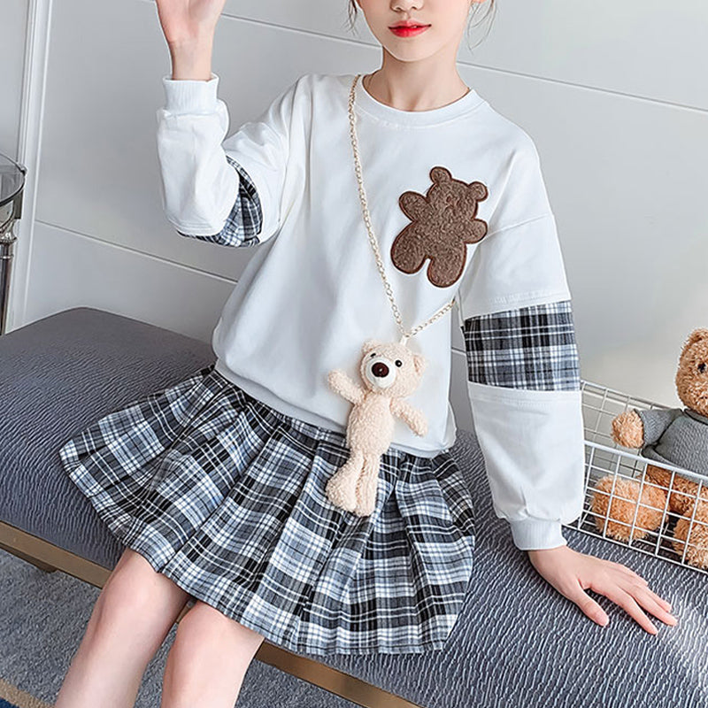 Kid Girl Bear Embroidered Blouse & Plaid Pleated Skirt Wholesale