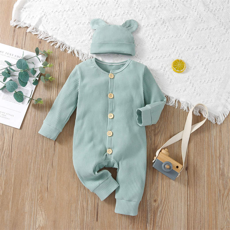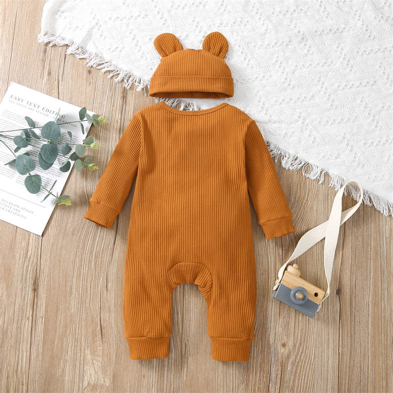 Baby Solid Color Pit Strip Fabric Long Sleeve Jumpsuit & Cute Ear Hat Wholesale