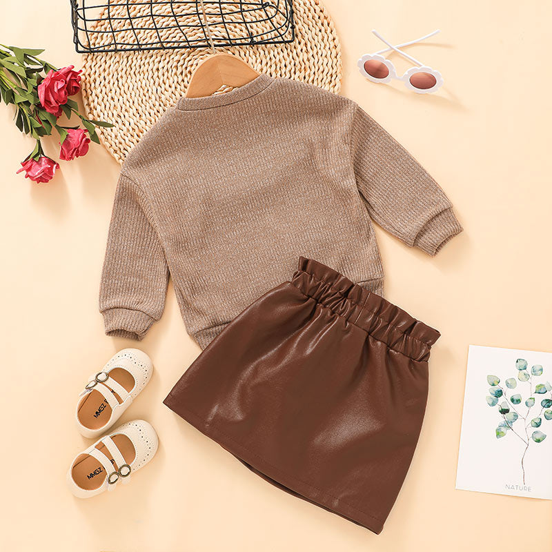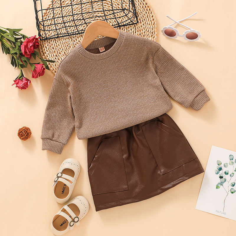 Toddler Girl Solid Color Long Sleeves Sweater & Leather Skirt Wholesale