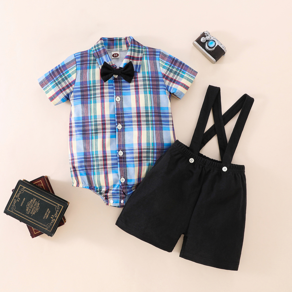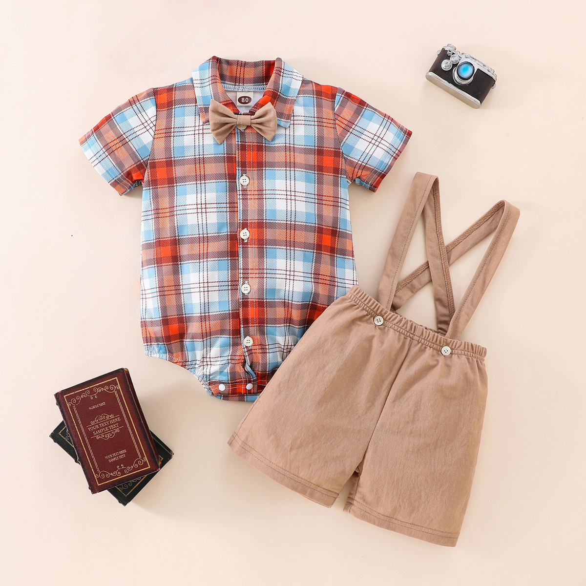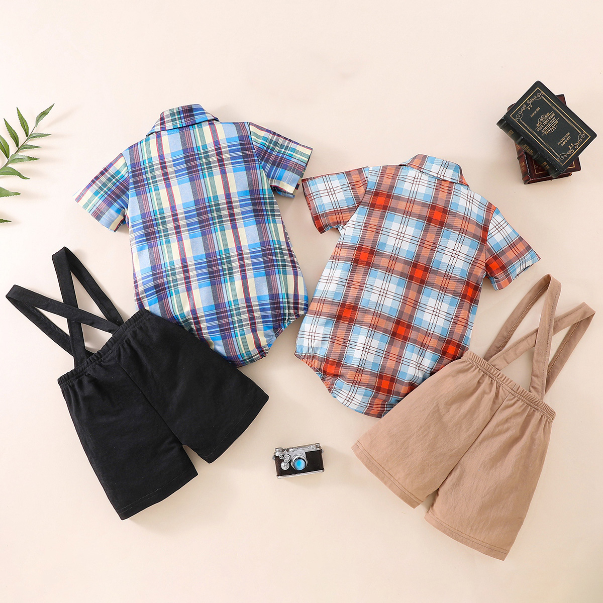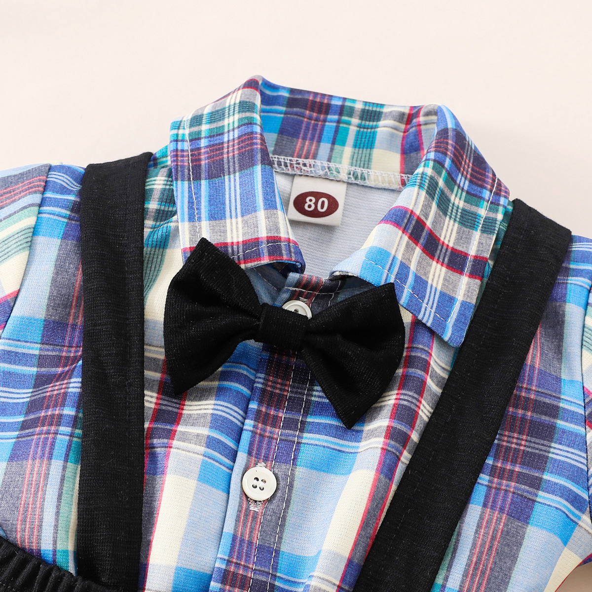 Baby Boy 3 Pieces Plaid Bodysuit & Suspender Shorts & Detachable Bow-tie Wholesale
