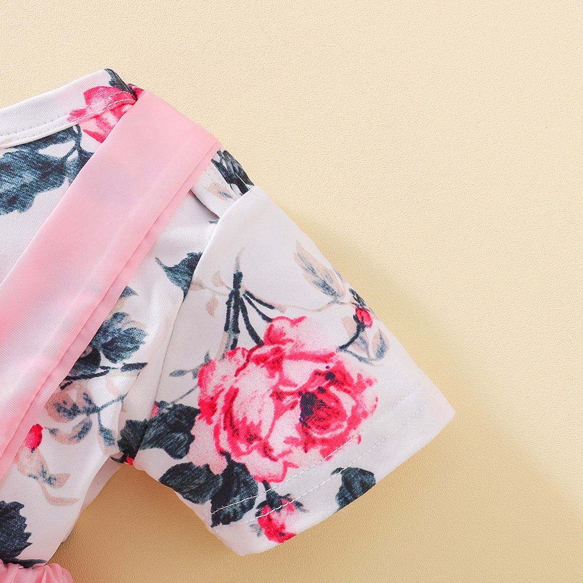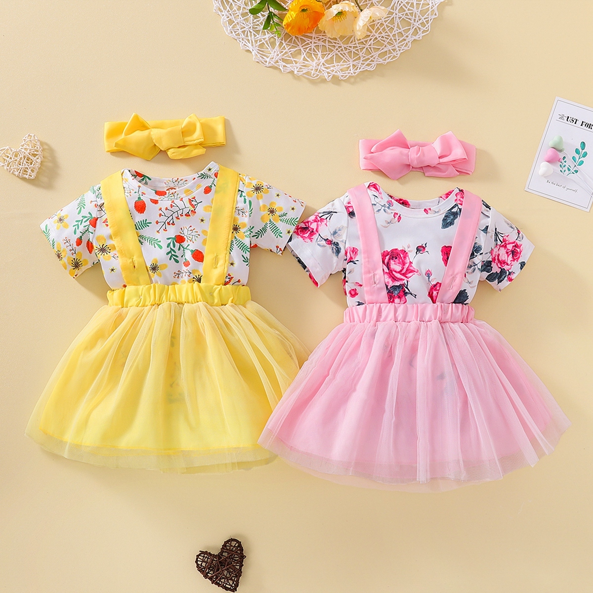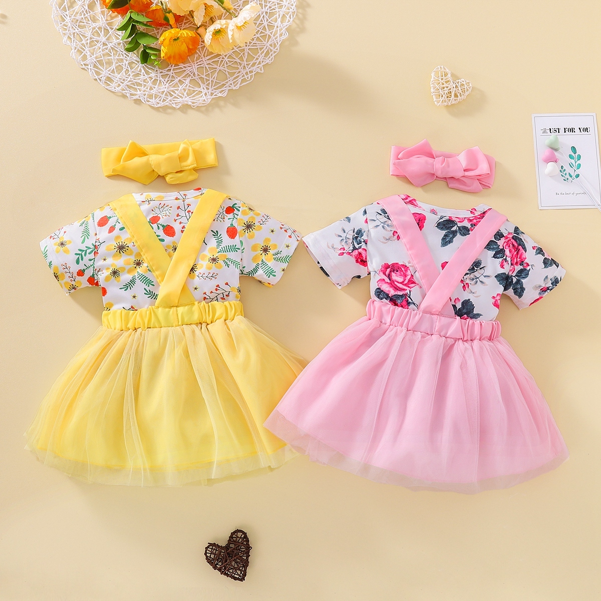 Baby Girl Sweet Floral Print Bodysuit And Tulle Sling Skirt with Headband Wholesale