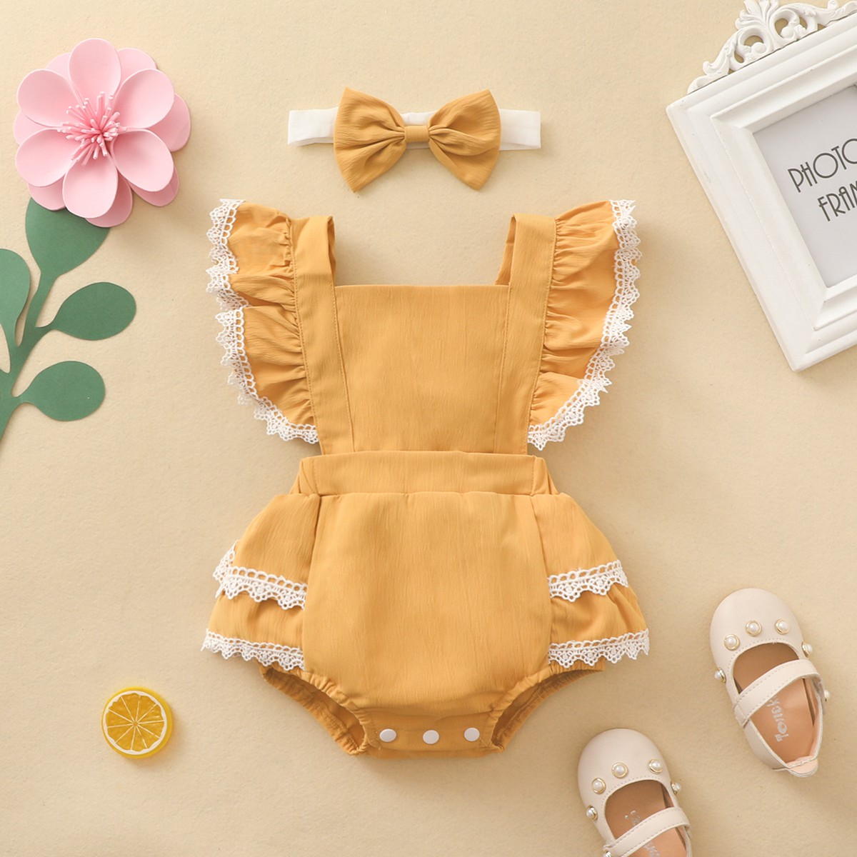 Baby Girl Sweet Solid Colour Ruffle Bodysuit with Headband Wholesale