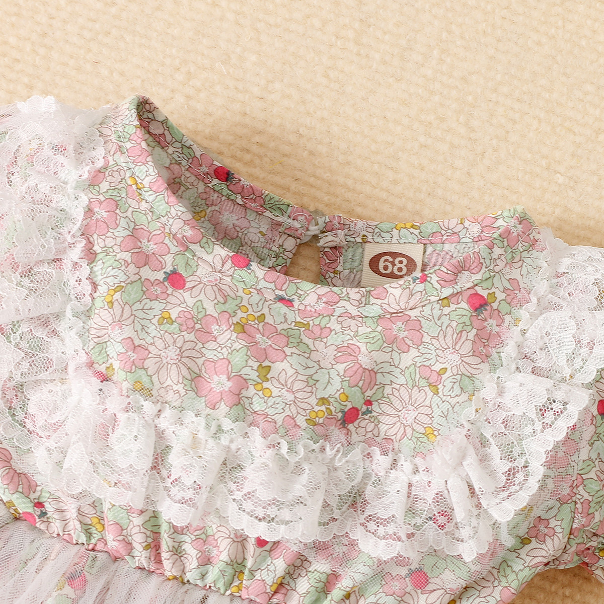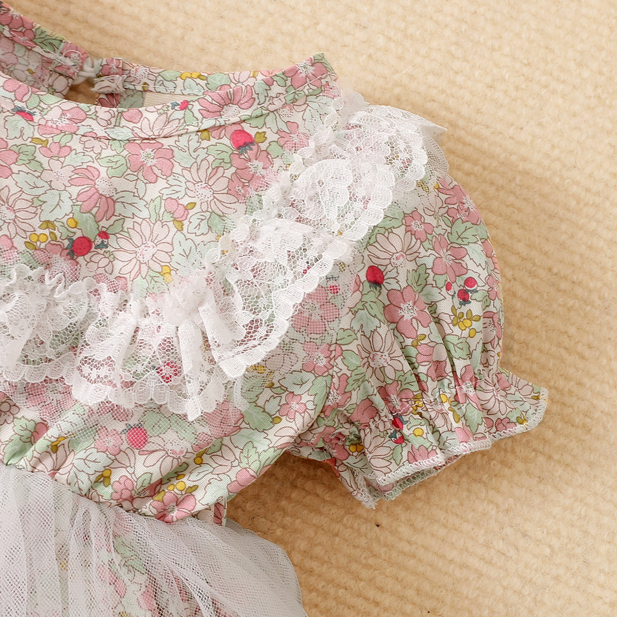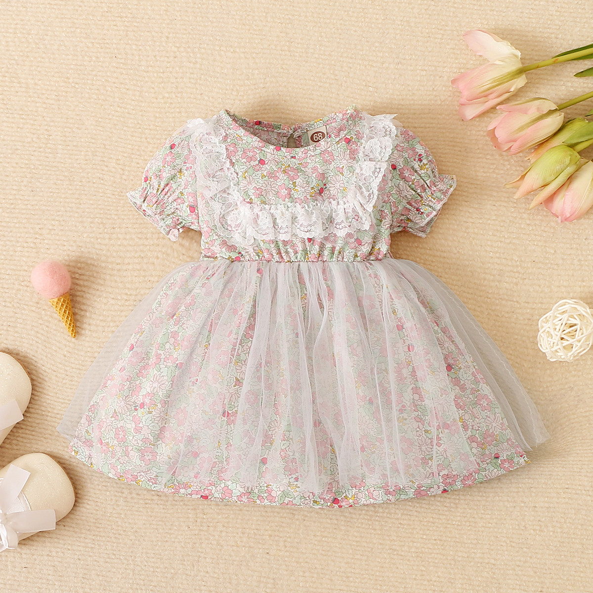 Baby Girl Floral Pattern Lace Decor Puff Sleeve Mesh Dress Wholesale