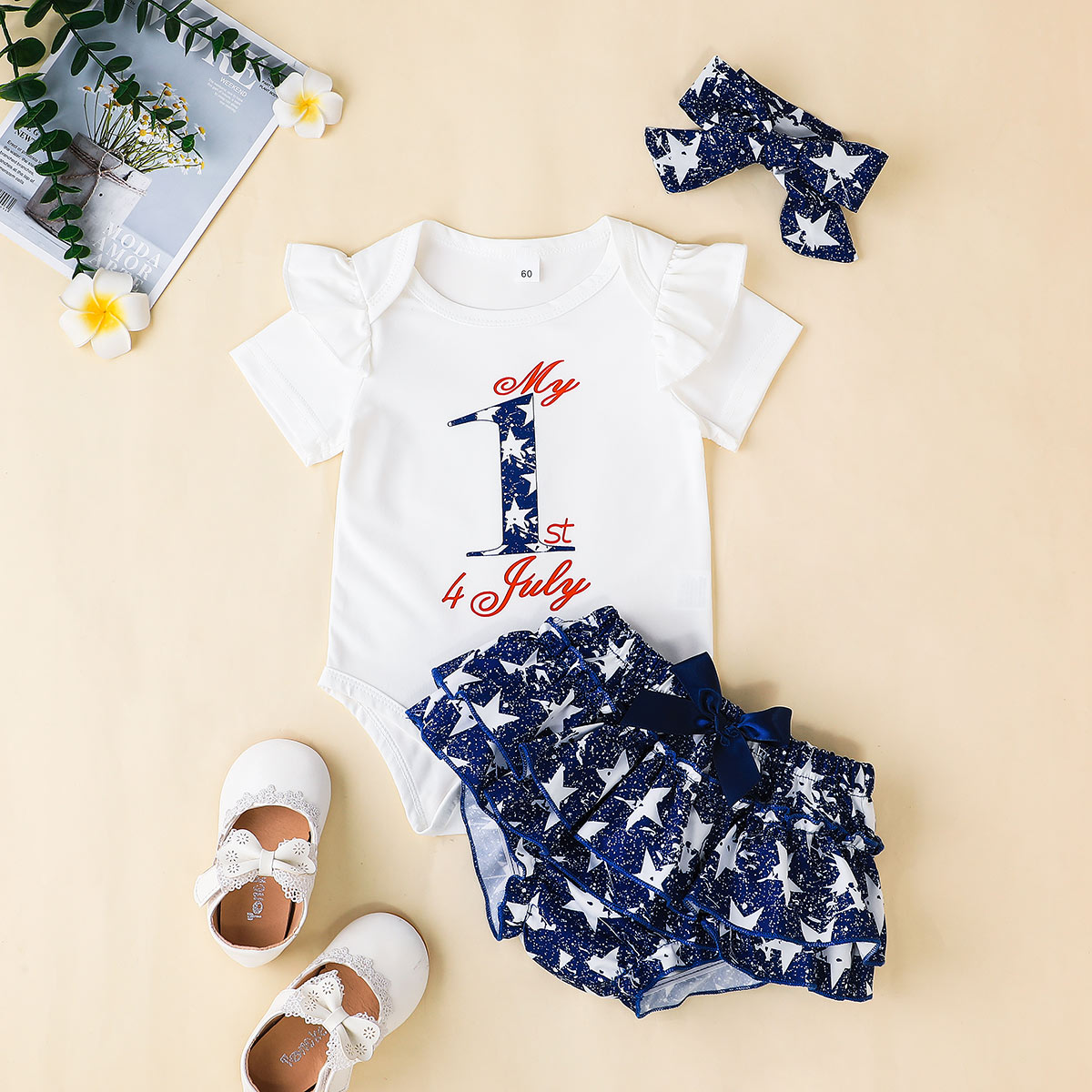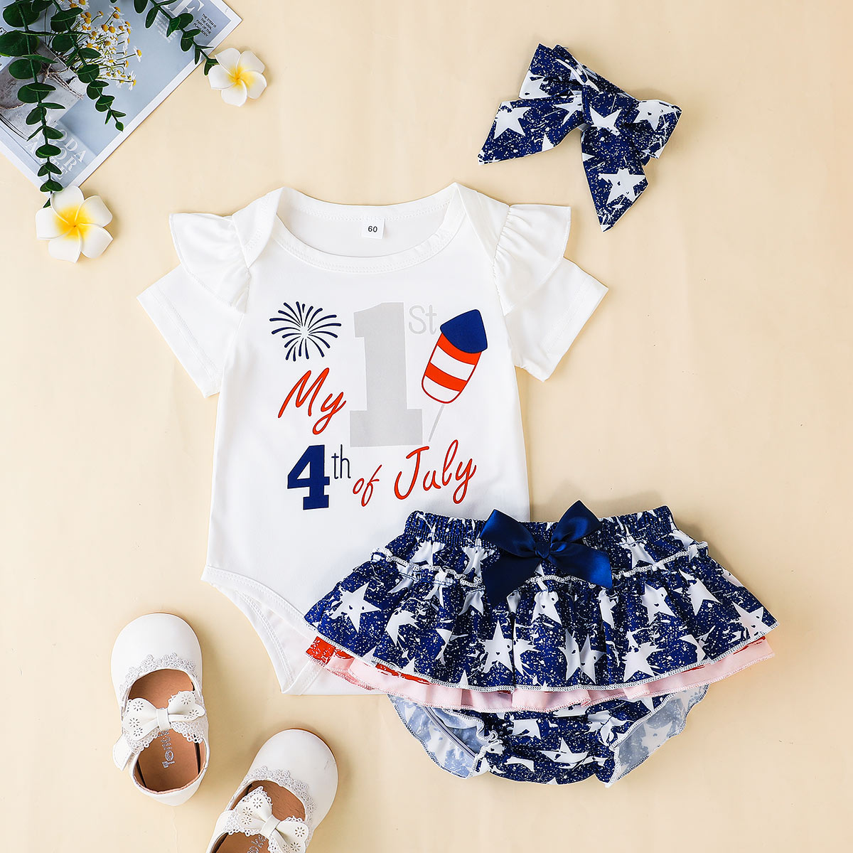 Baby Girl Independence Day Short Sleeve Bodysuit And Shorts with Headband Wholesale