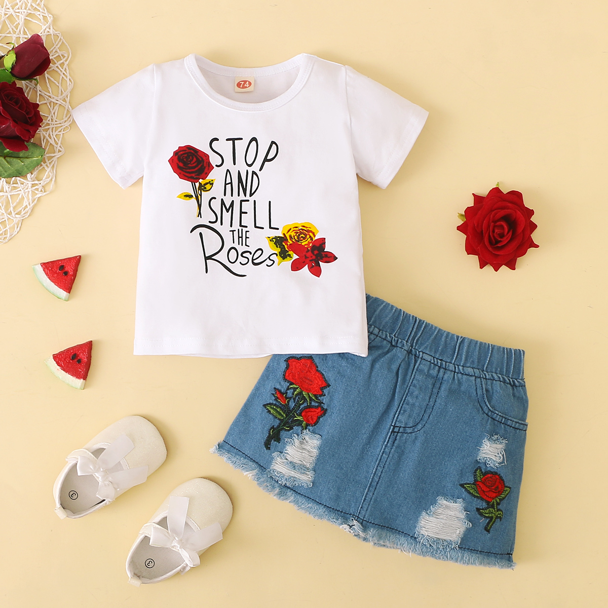 Baby Girl Short-sleeve Floral Top And Embroidered Denim Skirt Wholesale