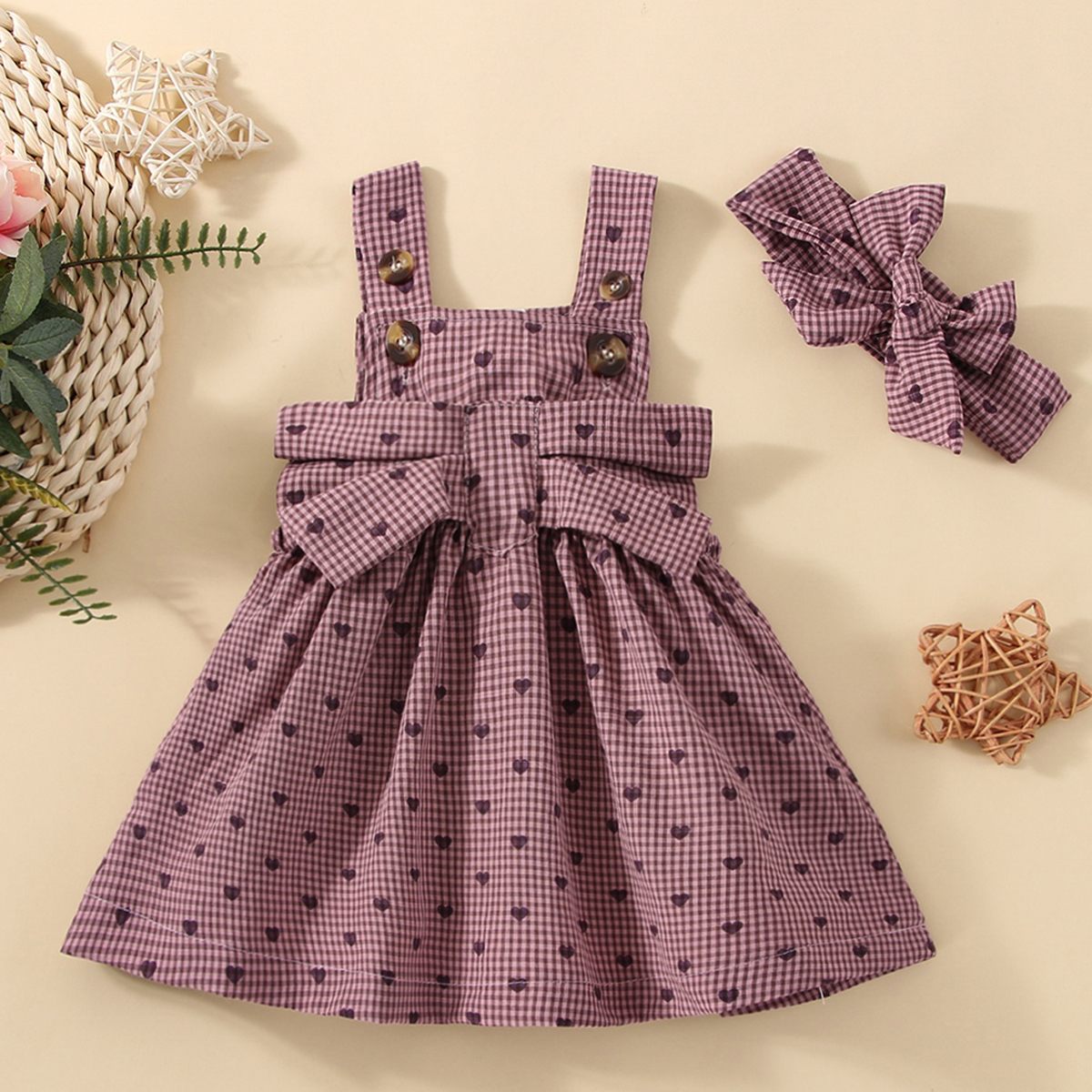 Baby Girl Sleeveless Patchwork Bowknot Heart-shaped Print Dress with Headband Wholesale