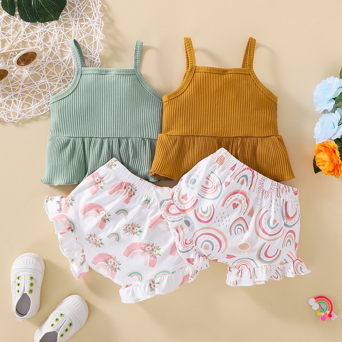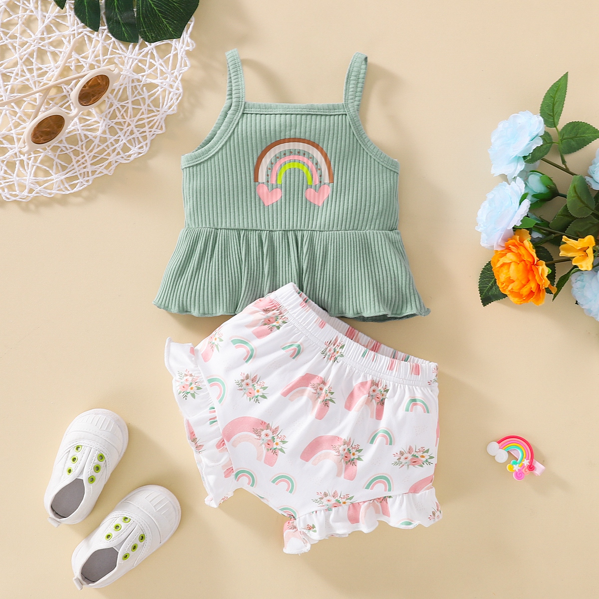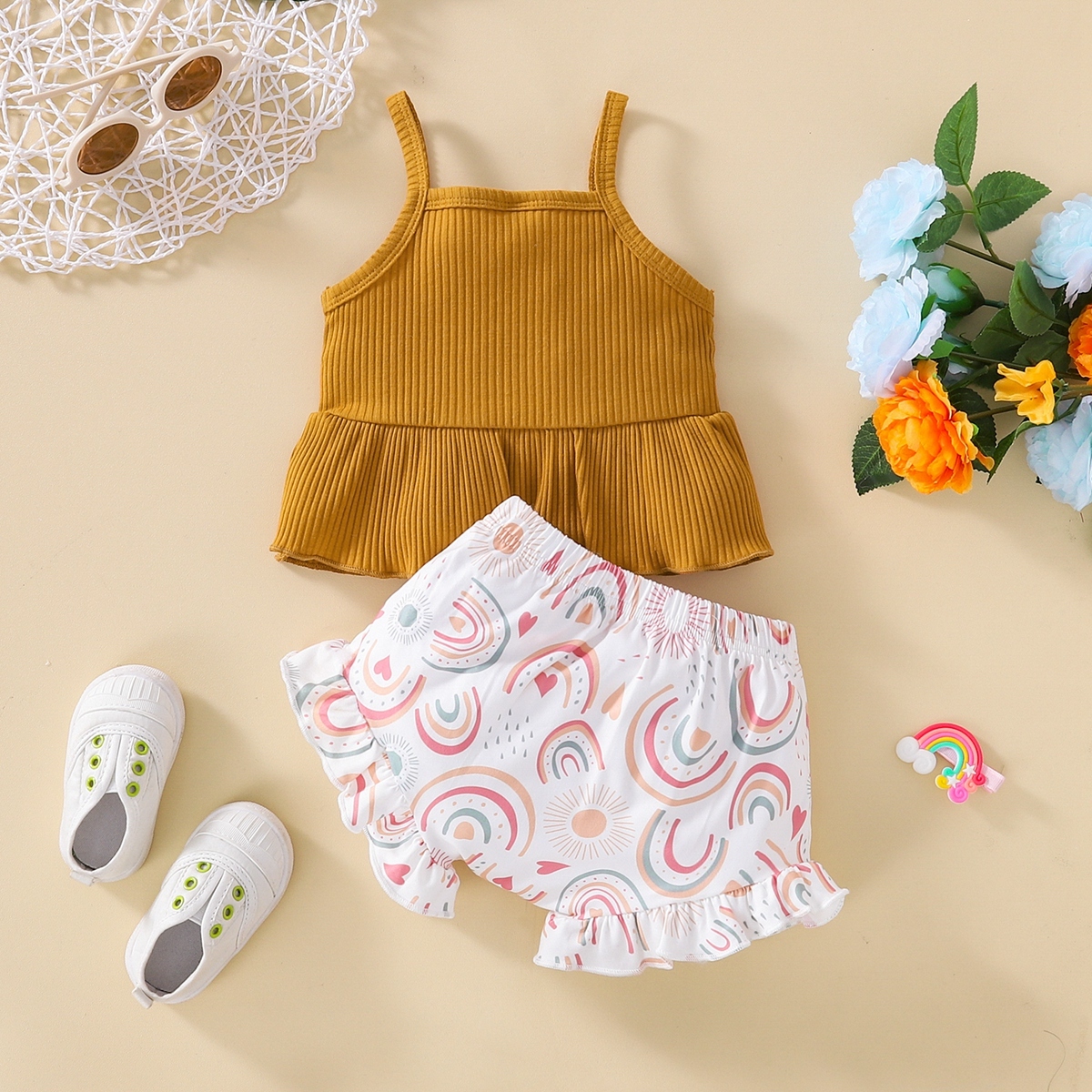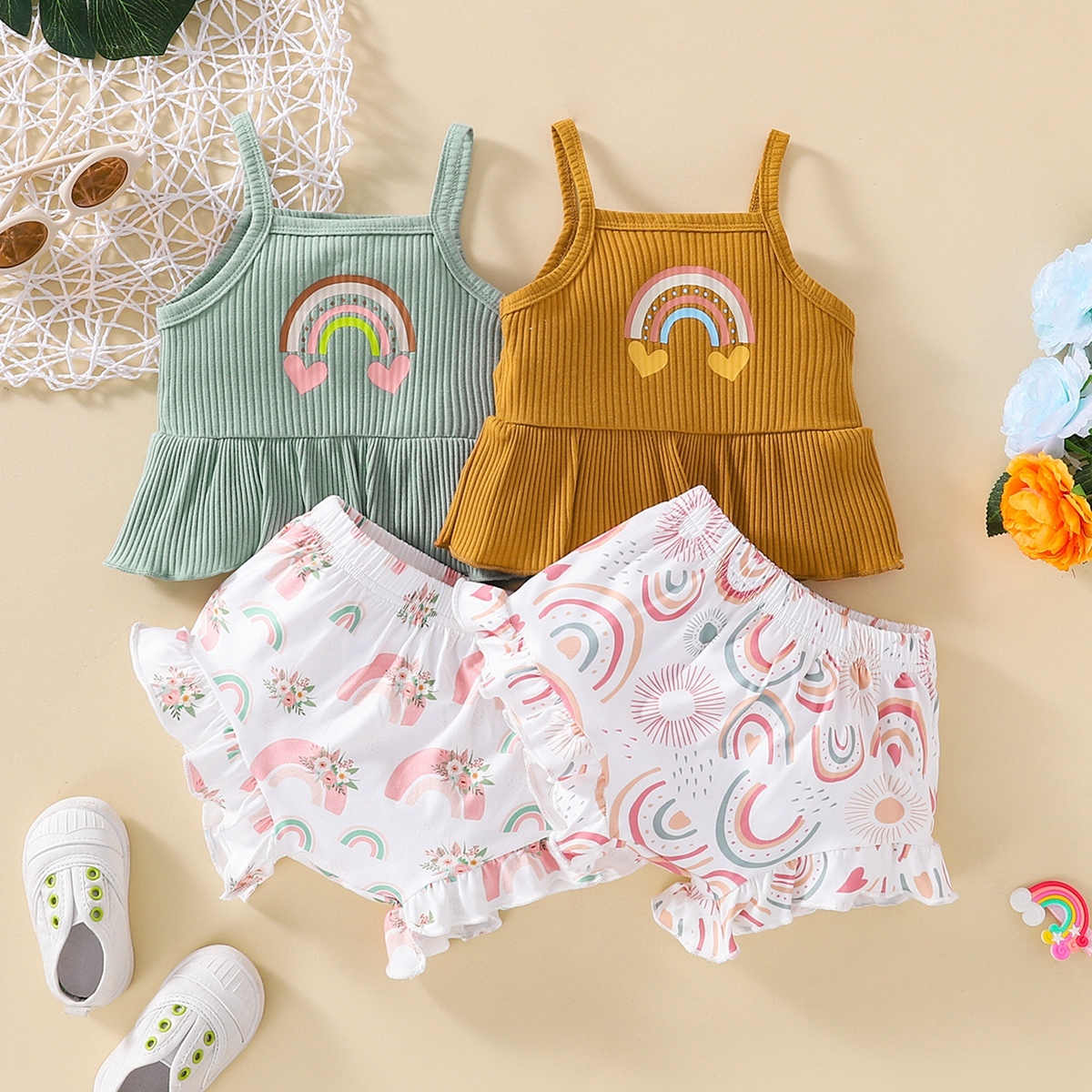 Baby Girl Sling Rainbow Top And Rainbow Print Shorts Wholesale