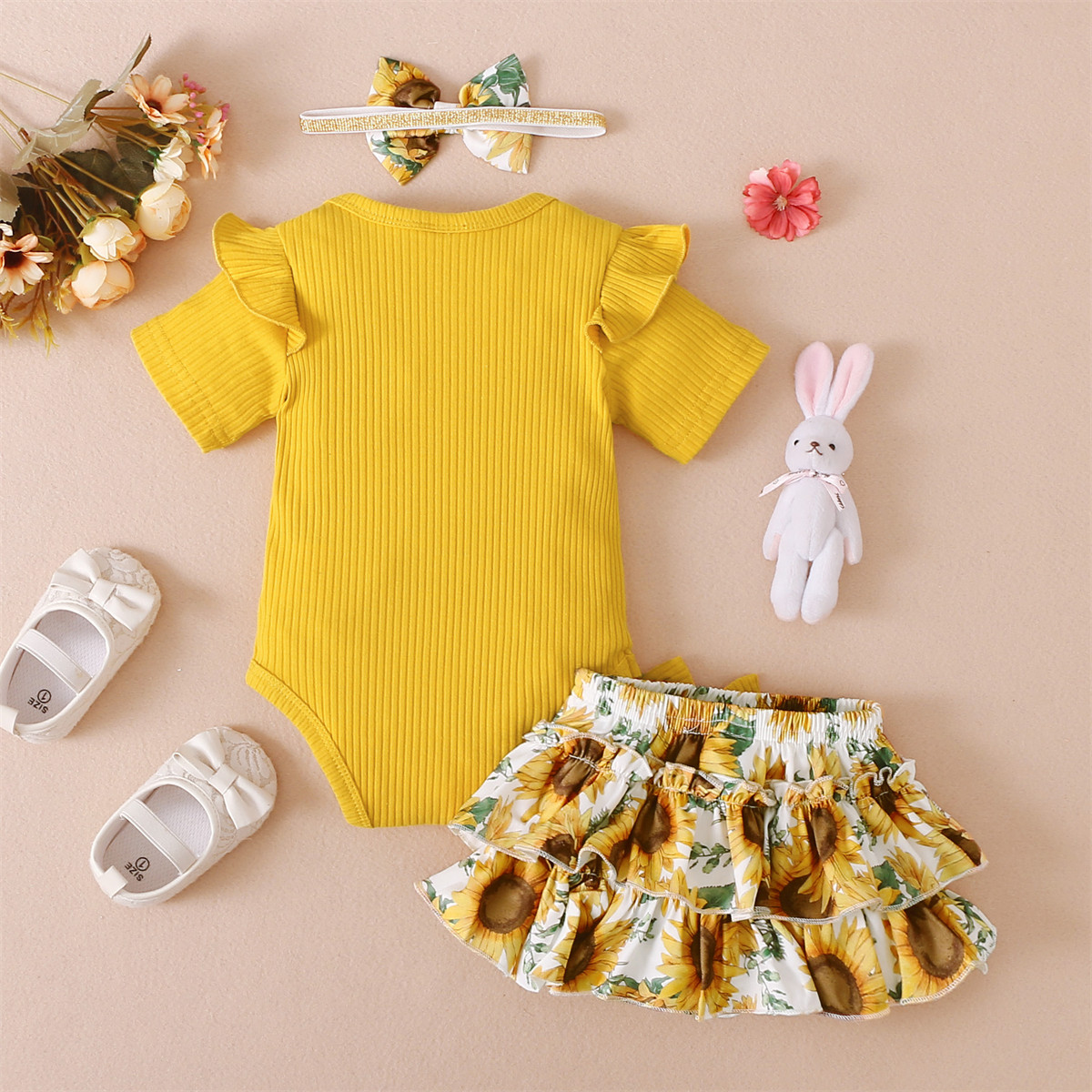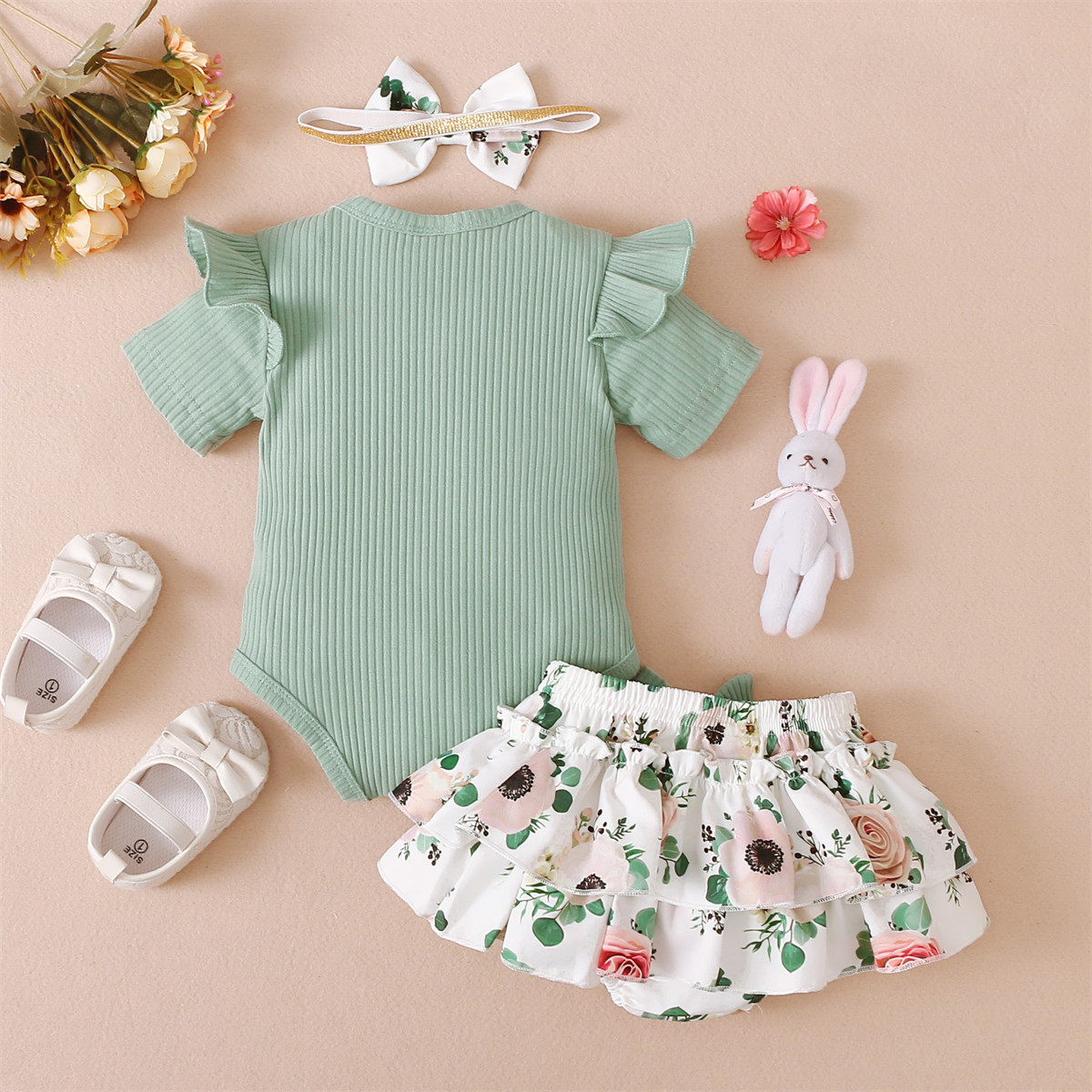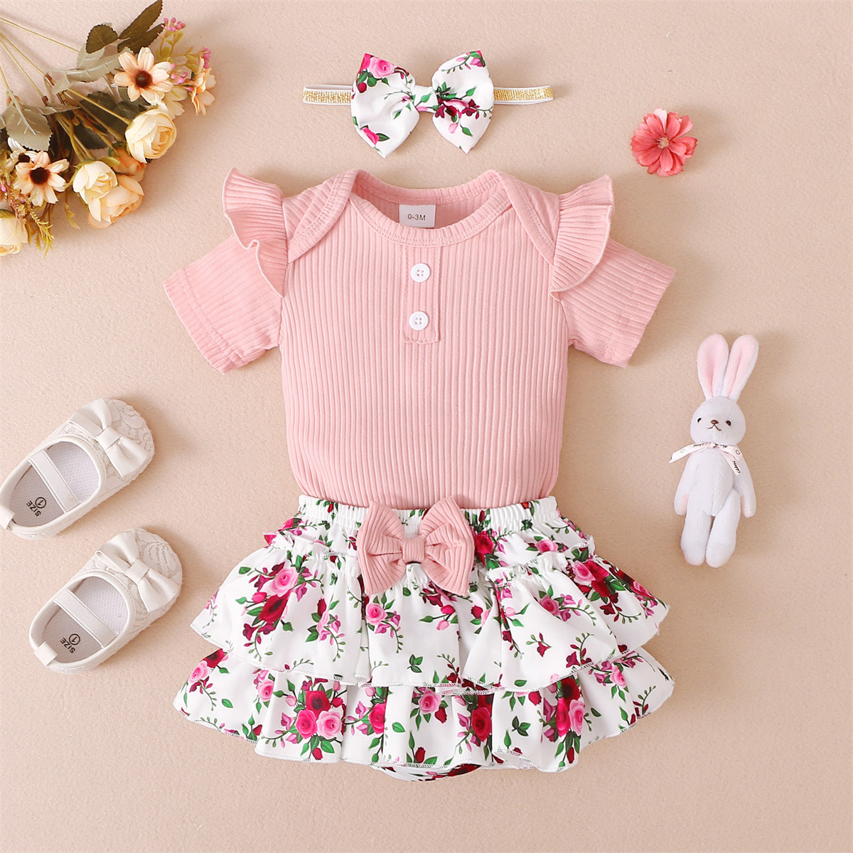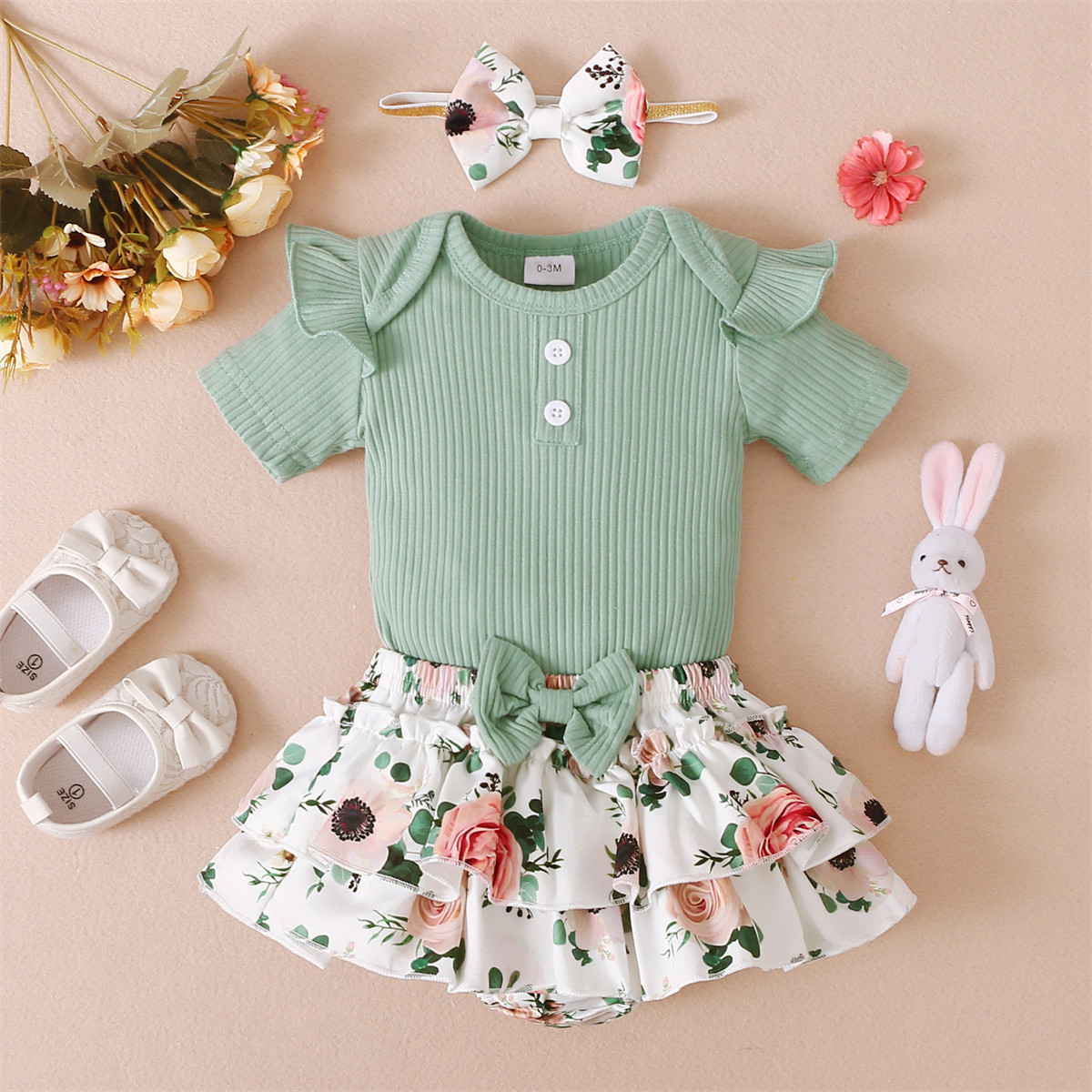 Baby Girl Solid Color Bodysuit & Floral Pattern Shorts & Headband Wholesale