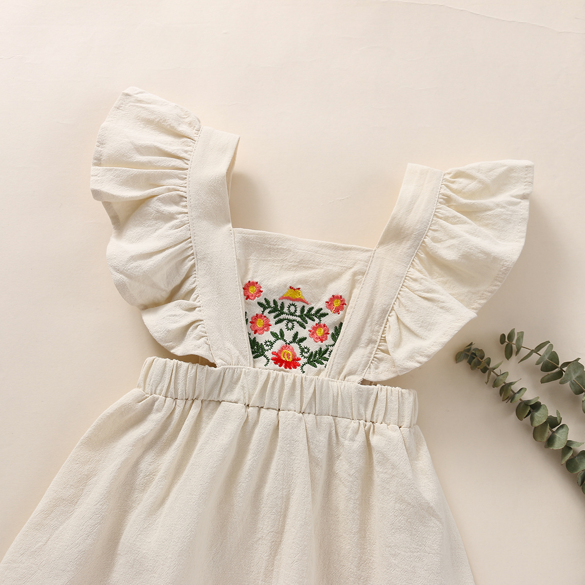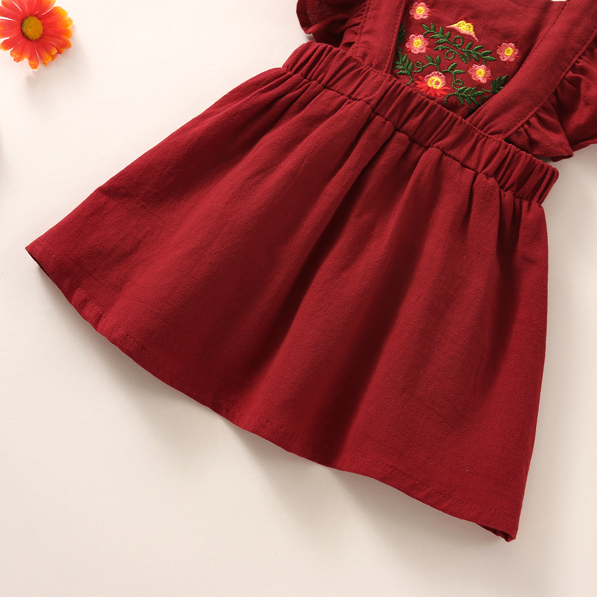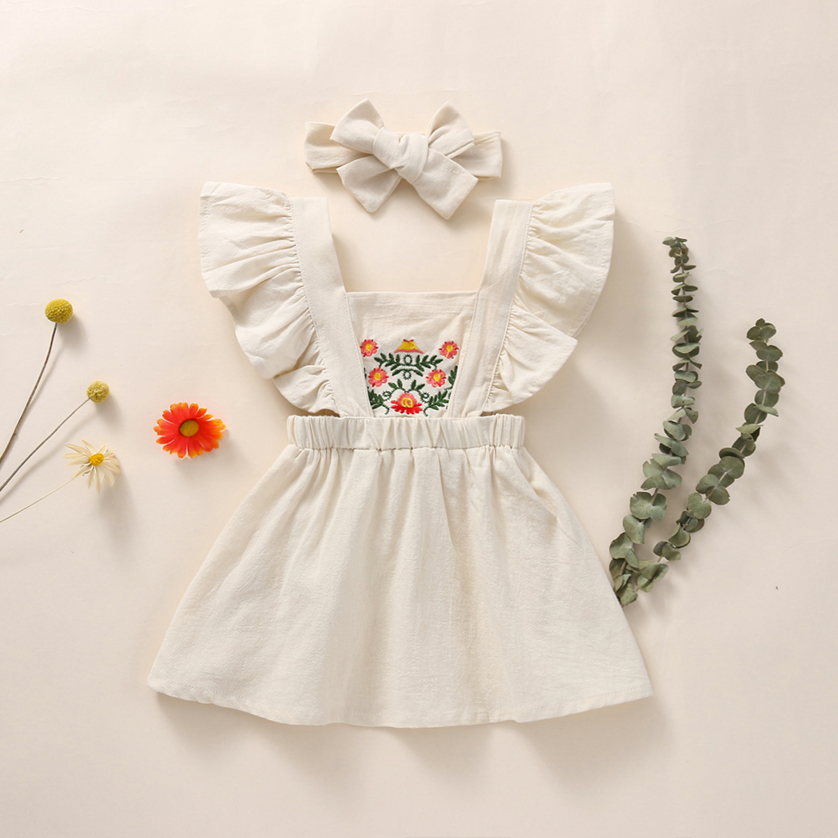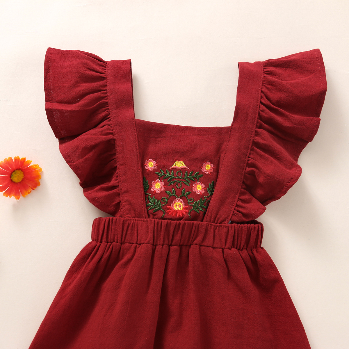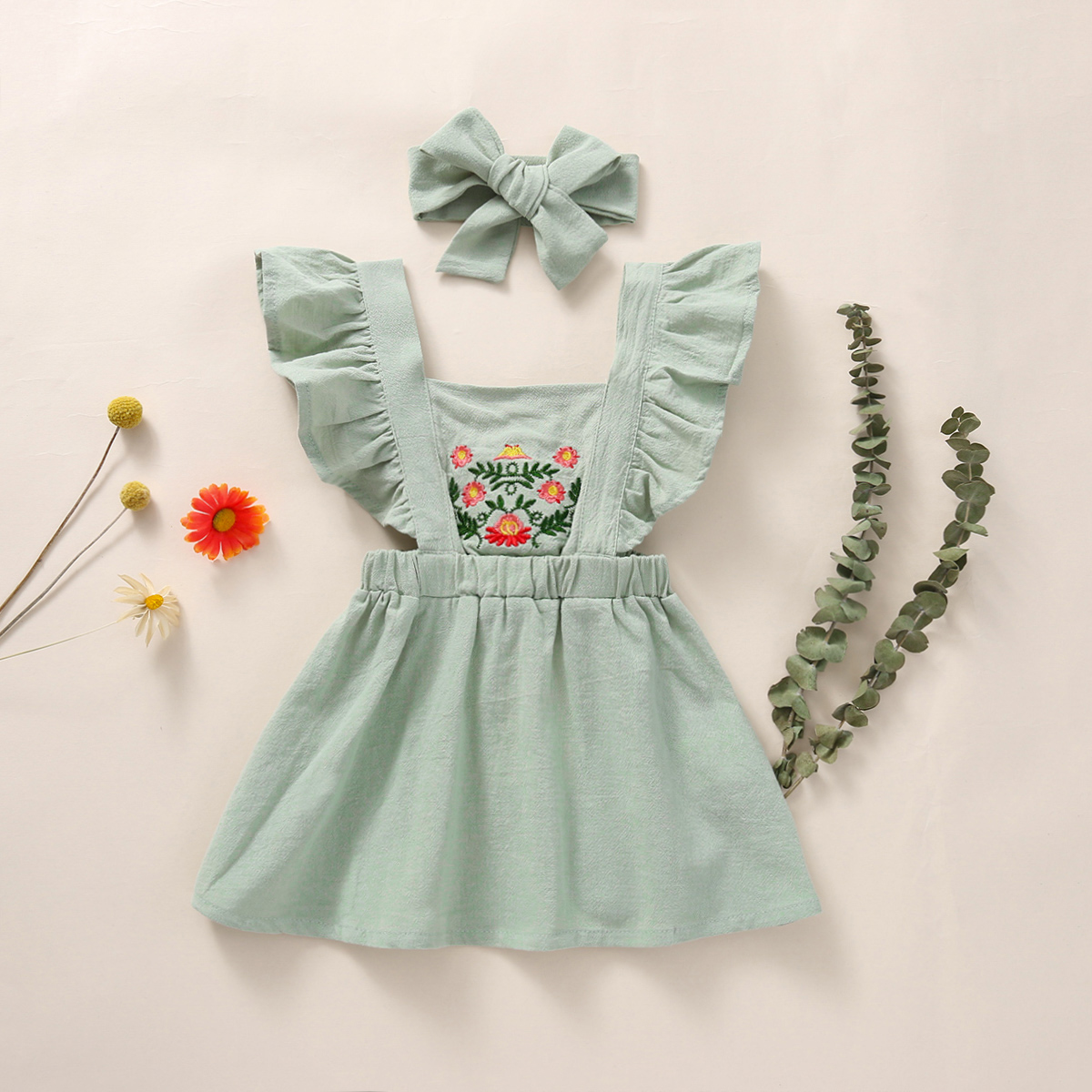Baby Girl Solid Color Embroidery Floral Pattern Square Neck Ruffle-sleeve Dress & Headband Wholesale