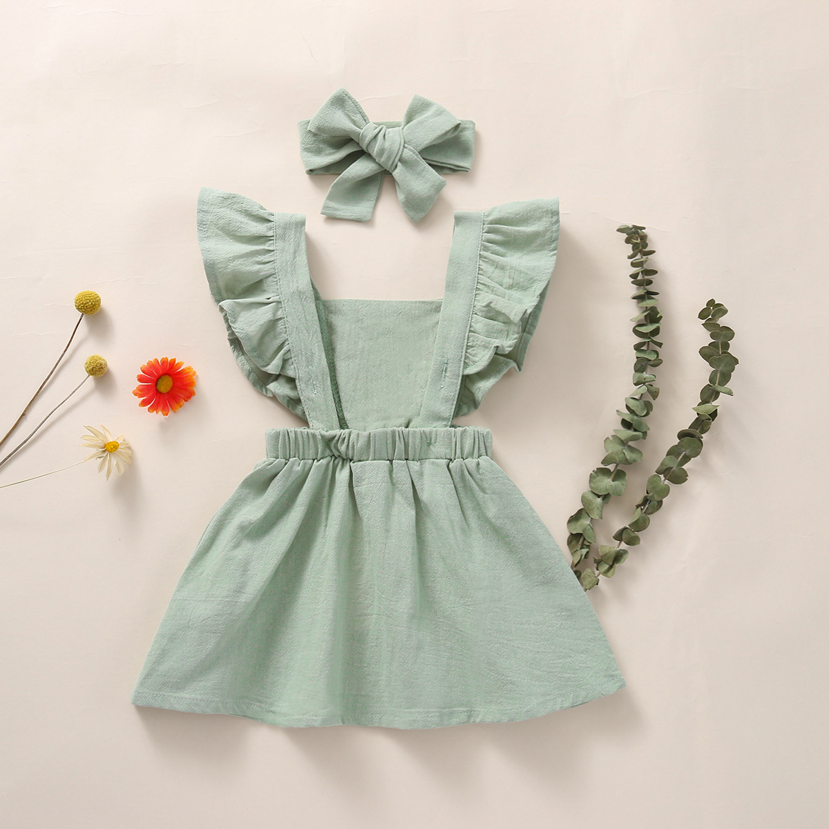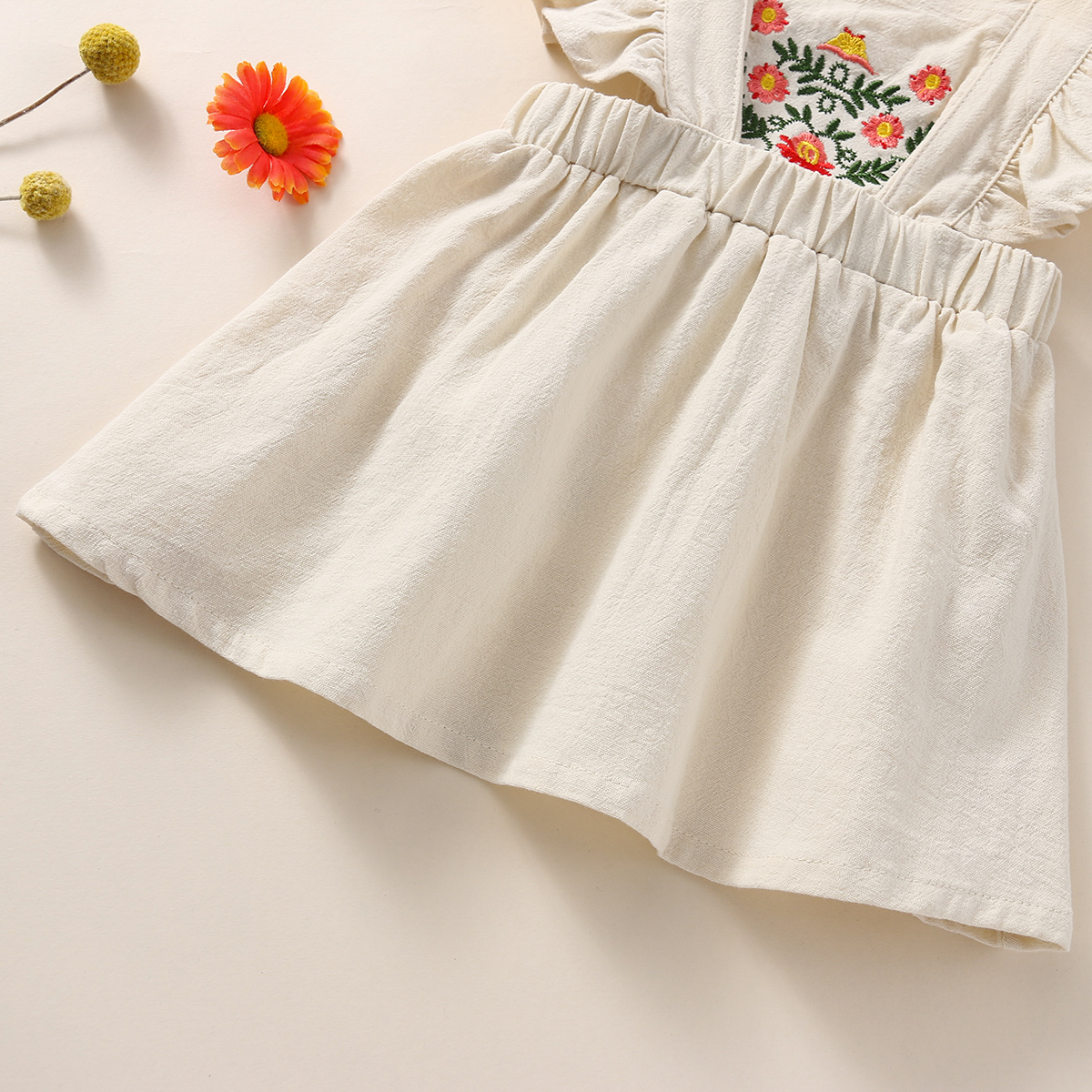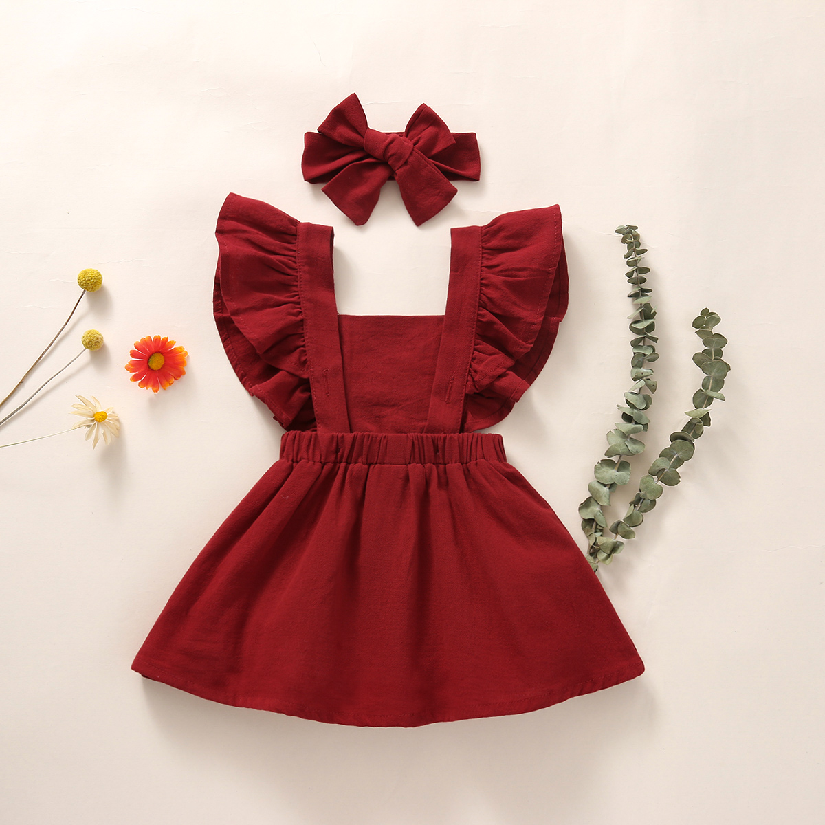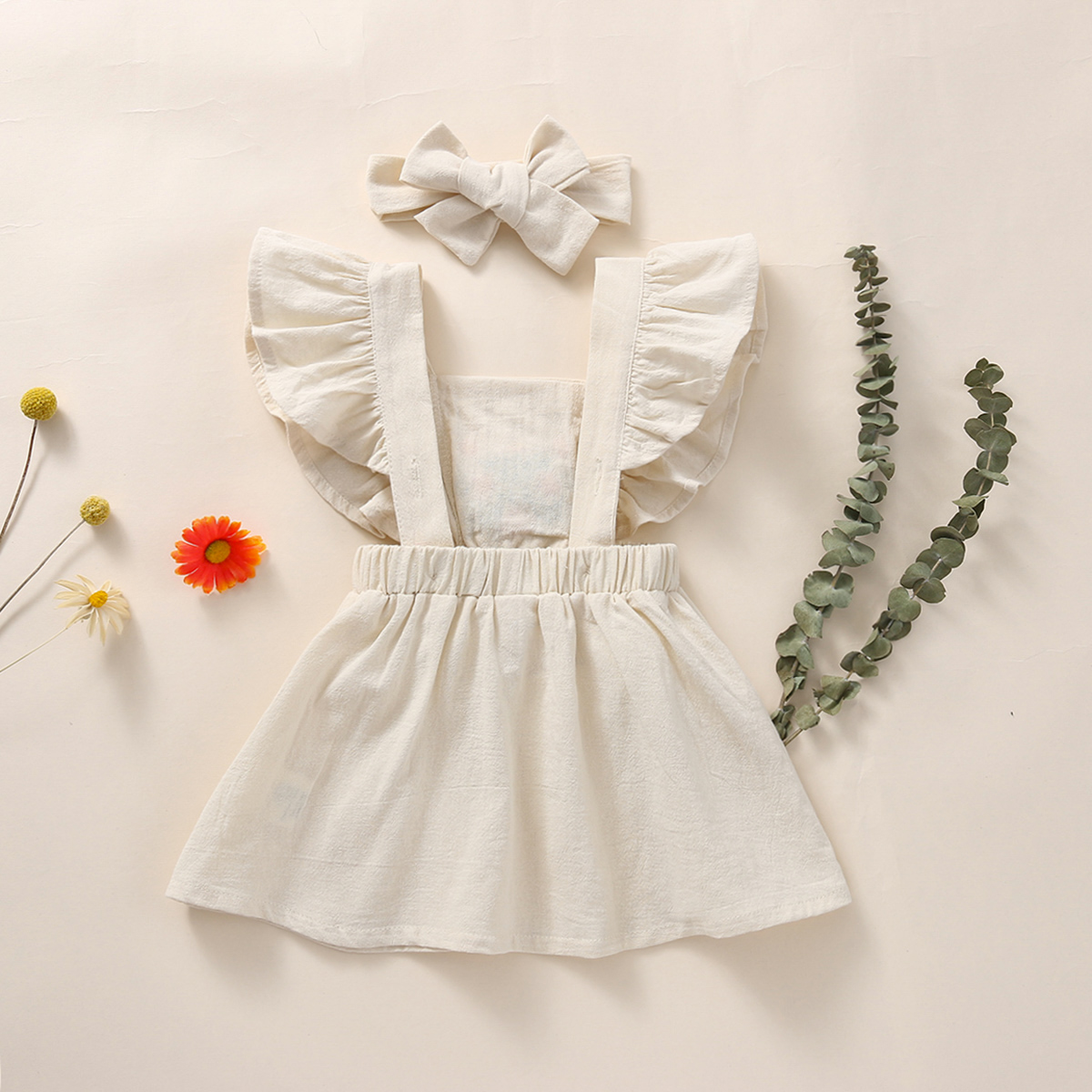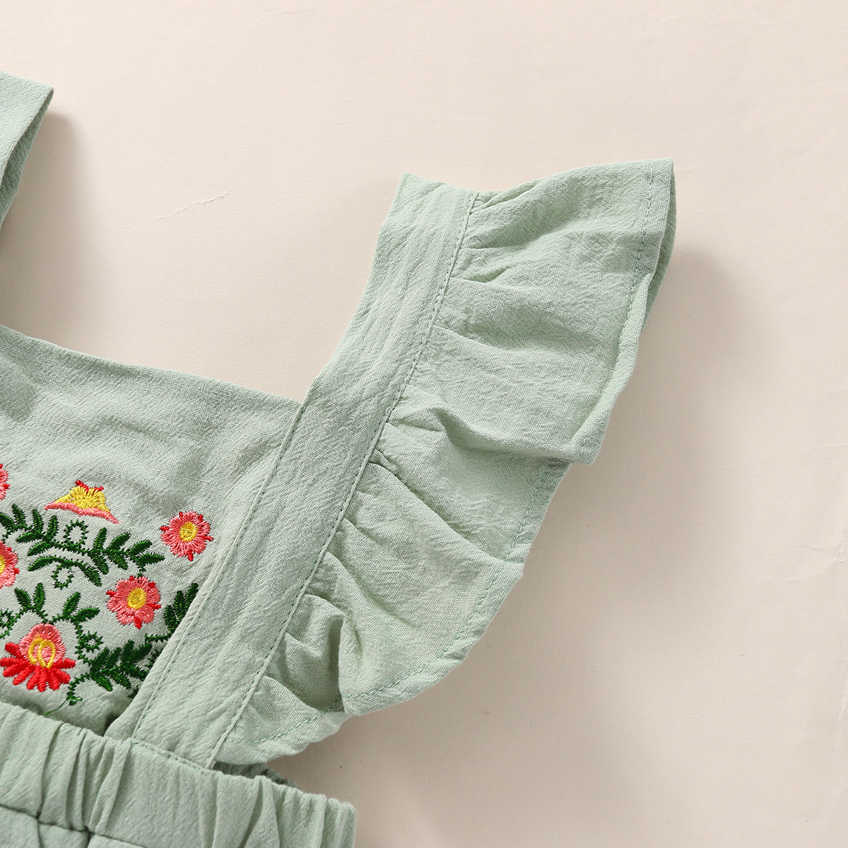 Baby Girl Solid Color Embroidery Floral Pattern Square Neck Ruffle-sleeve Dress & Headband Wholesale