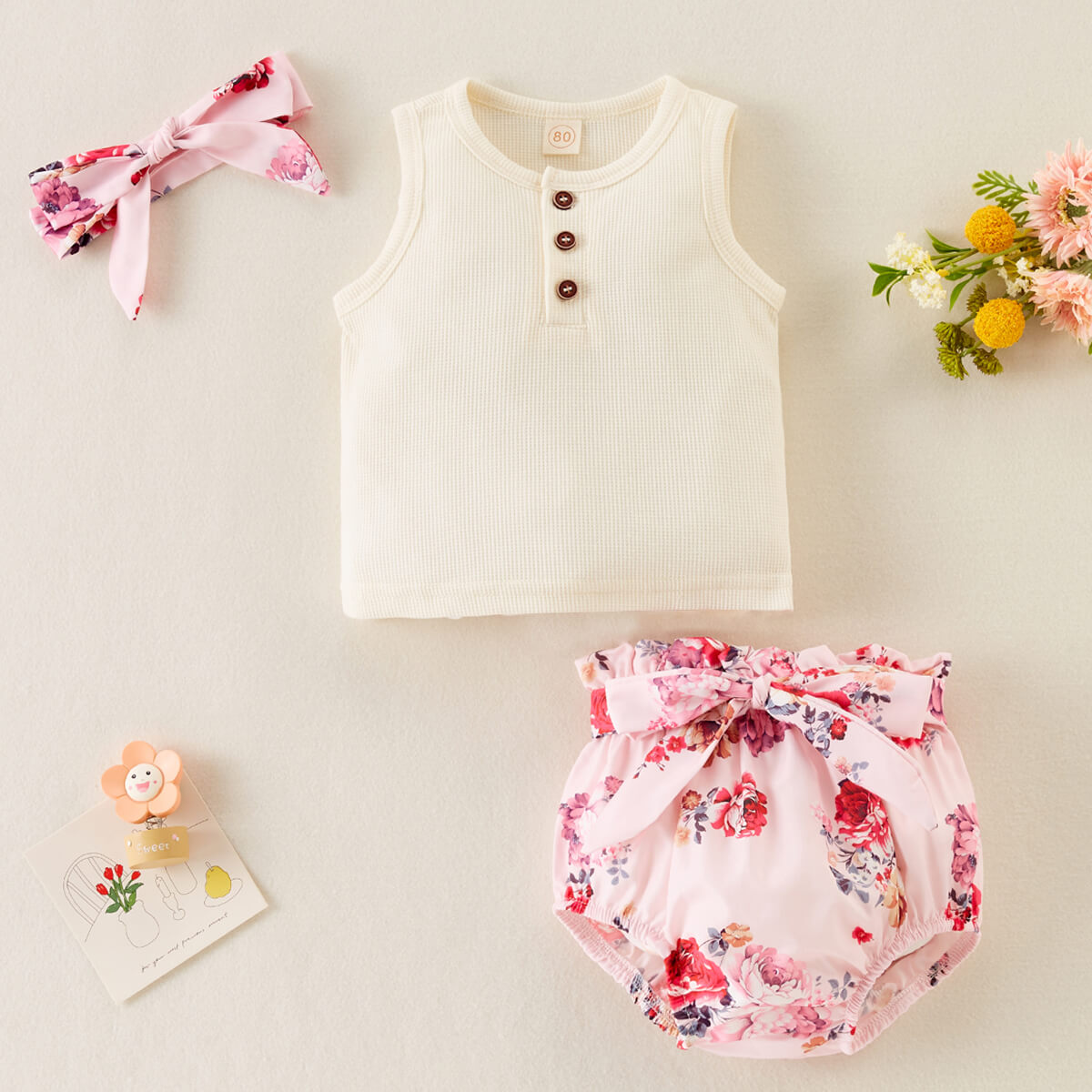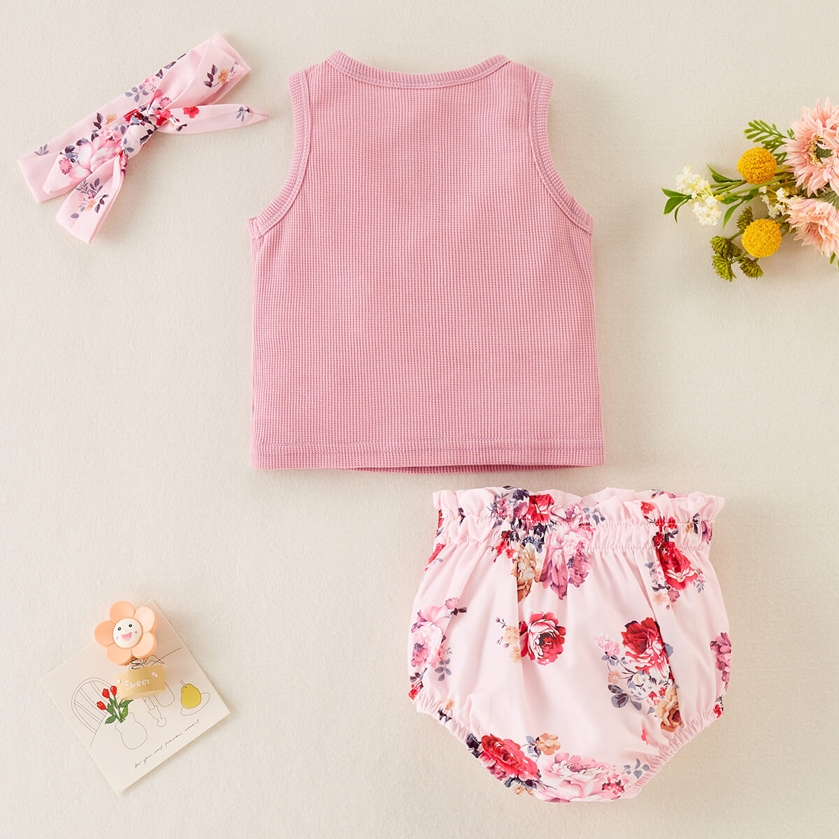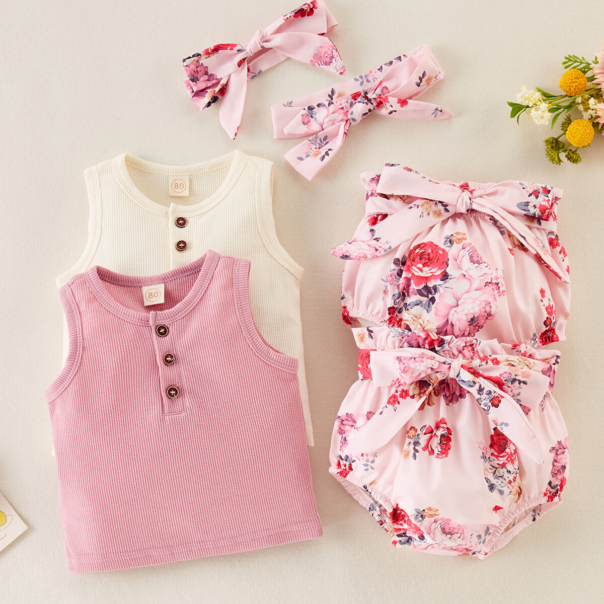 Baby Girl Solid Color Sleeveless T-Shirt & Floral Pattern Shorts & Headband Wholesale
