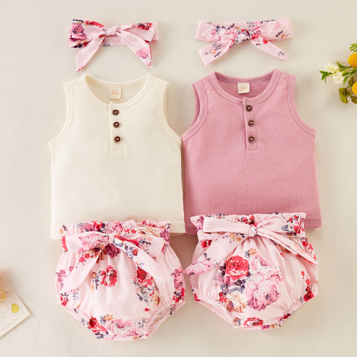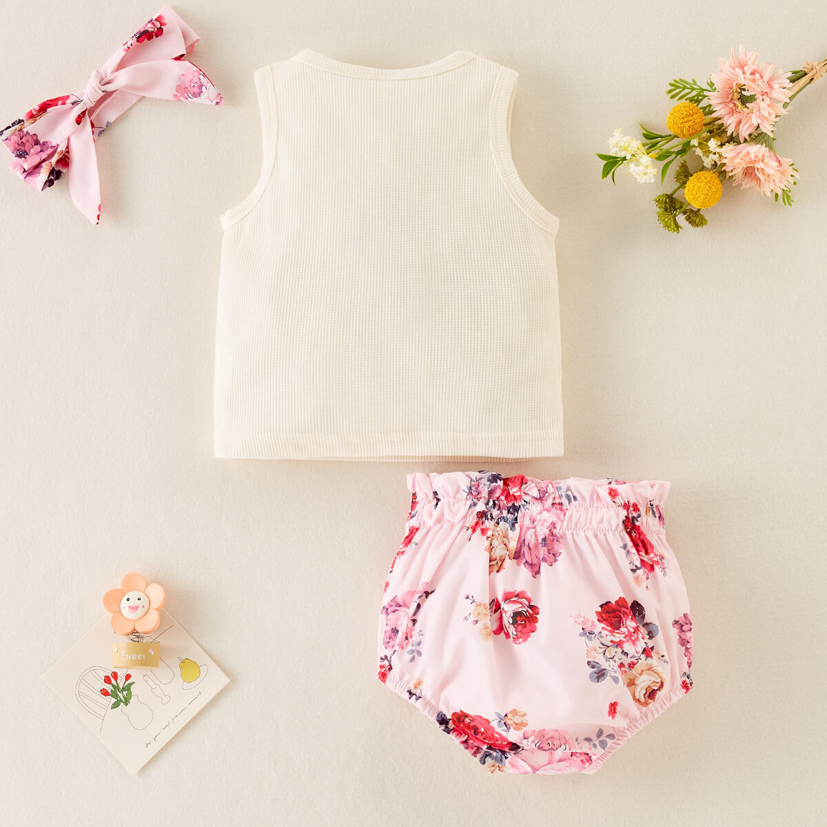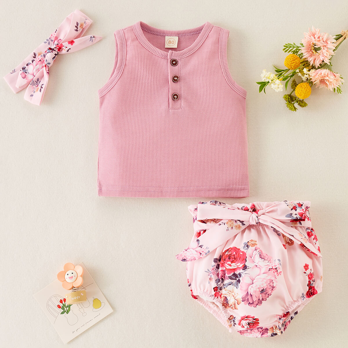 Baby Girl Solid Color Sleeveless T-Shirt & Floral Pattern Shorts & Headband Wholesale