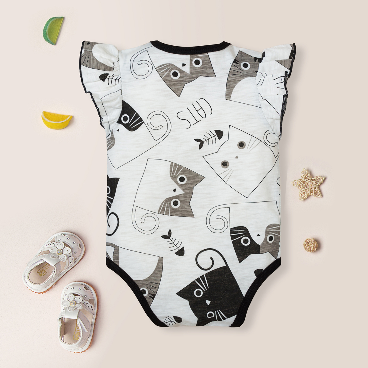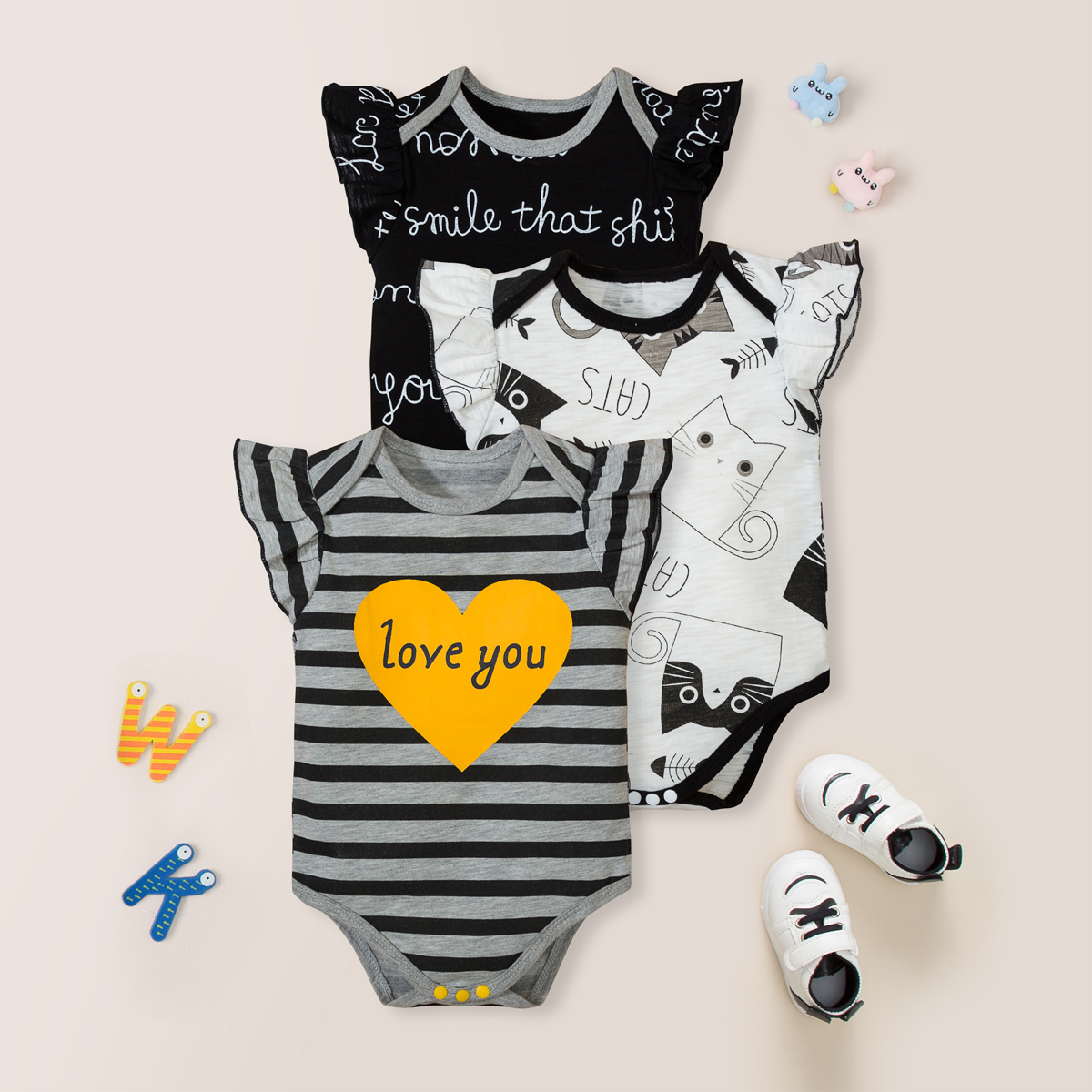 Baby Girl Stripes Heart-shaped Letter Cat Pattern Ruffle-sleeve Bodysuit Wholesale