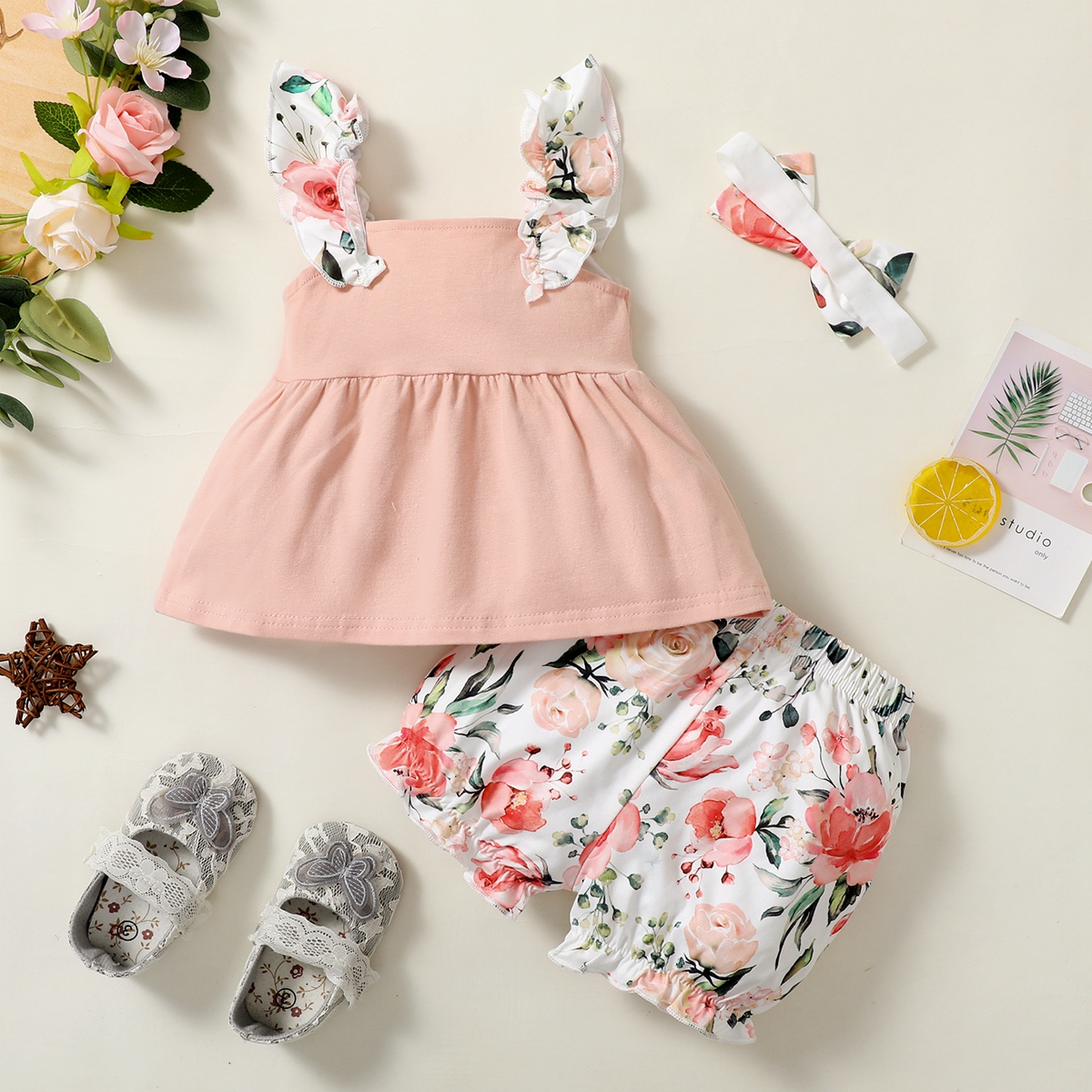 Baby Girl Sweet Solid Sleeveless Top And Floral Shorts with Headband Wholesale