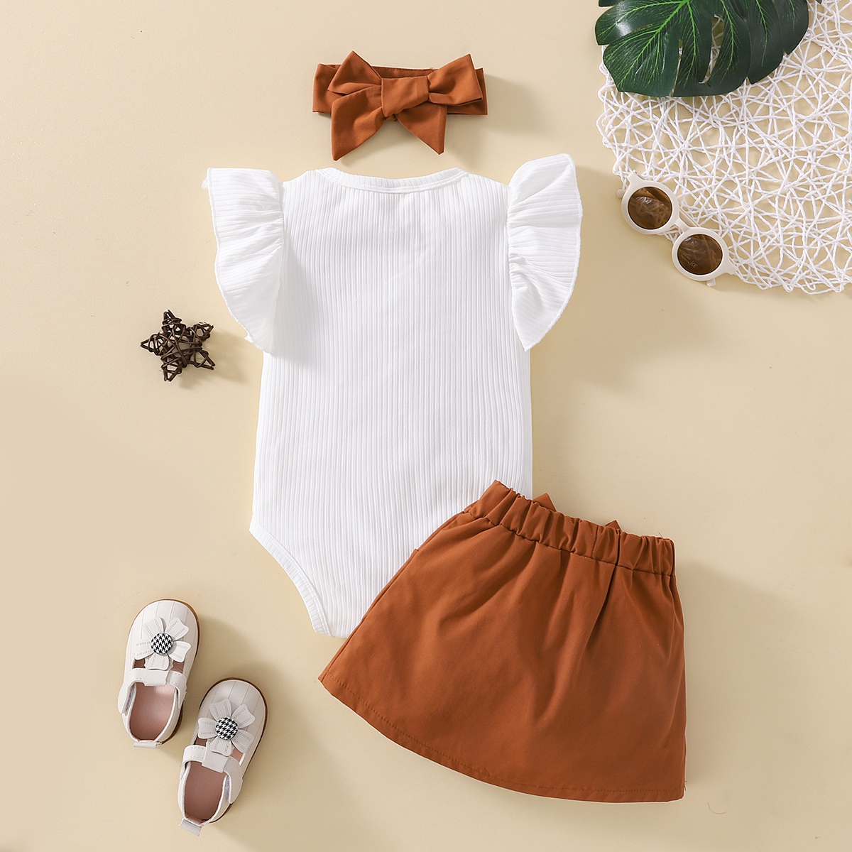Baby Solid Colour Ruffle Bodysuit And Overall Skirt With Headband Wholesale
