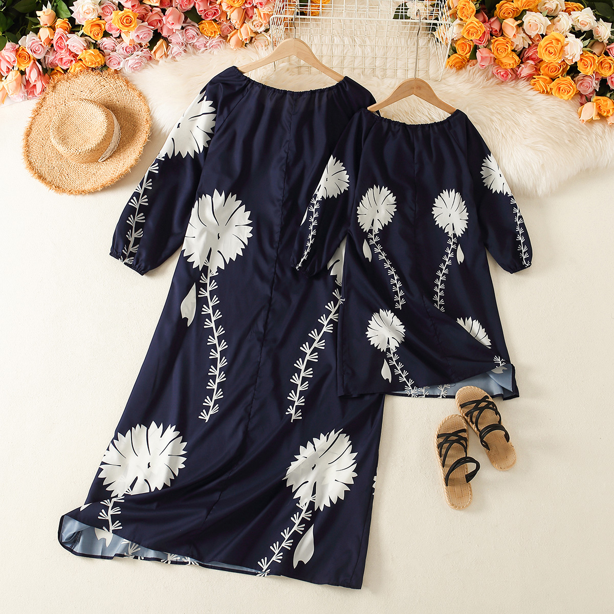 Elegant Floral Print Round neck Long Sleeve Dress for Mom and Me Wholesale