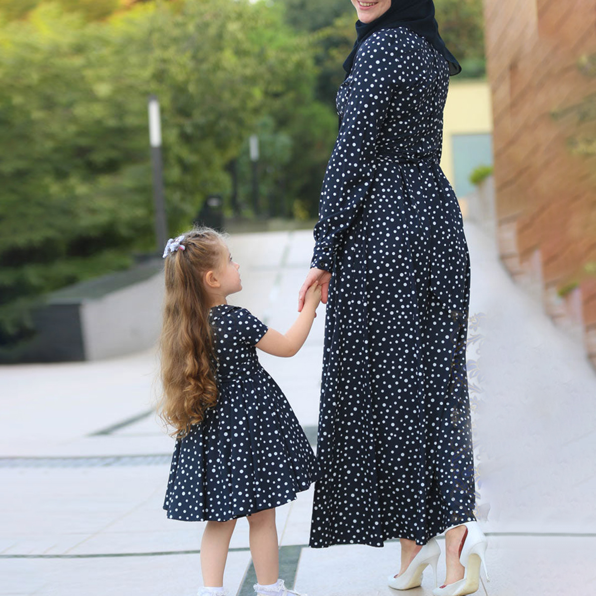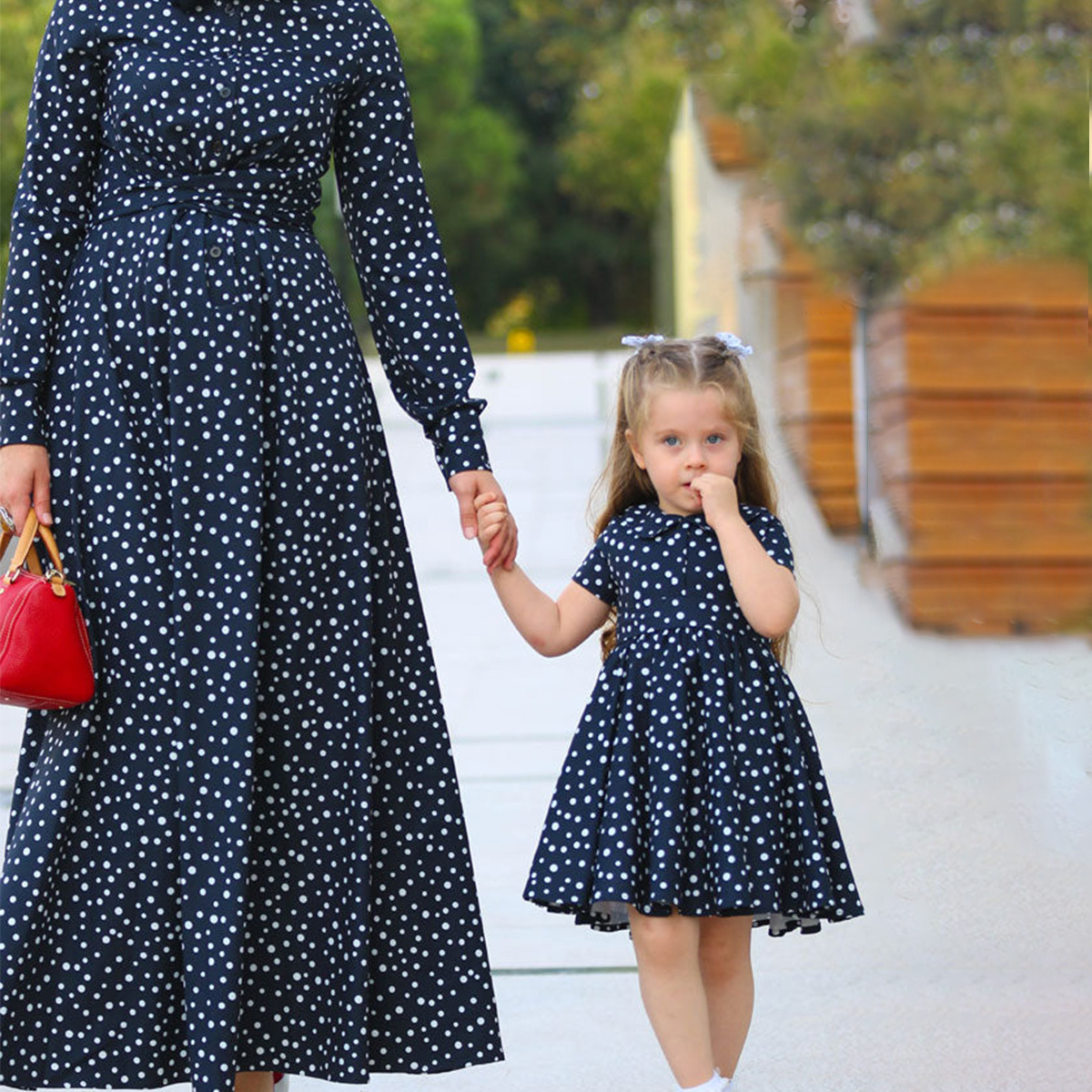 Elegant Wave Point Print Long Sleeve Dress for Mom and Me Wholesale
