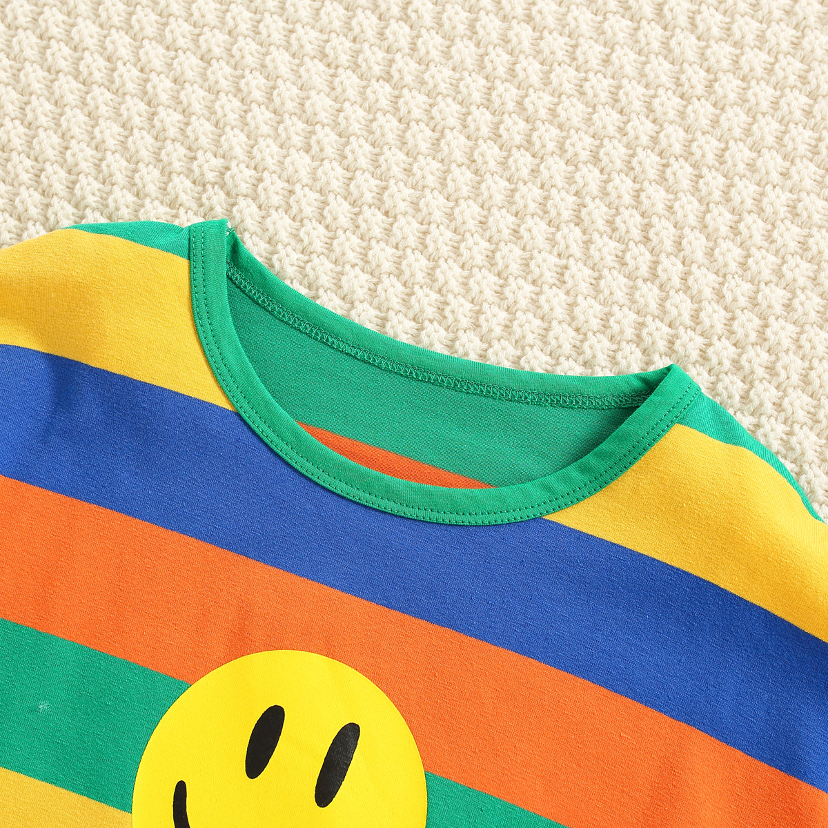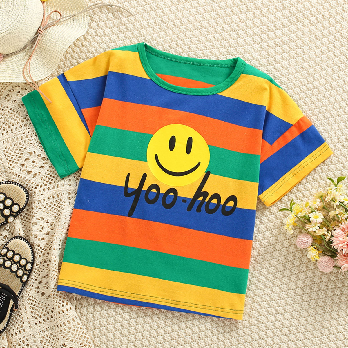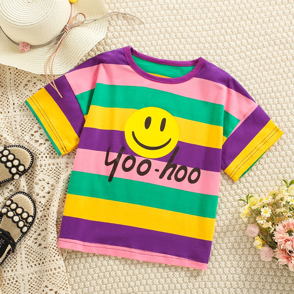 Girls Summer Color-block Rainbow Smiley Printing T-shirt Wholesale
