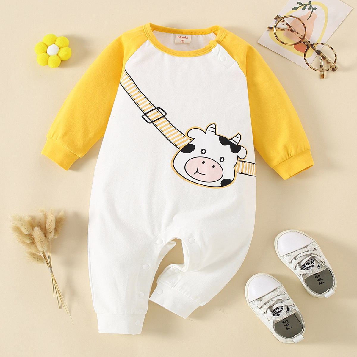 hibobi Baby Yellow Cow Print Patchwork Long Sleeve Bodysuit Wholesale