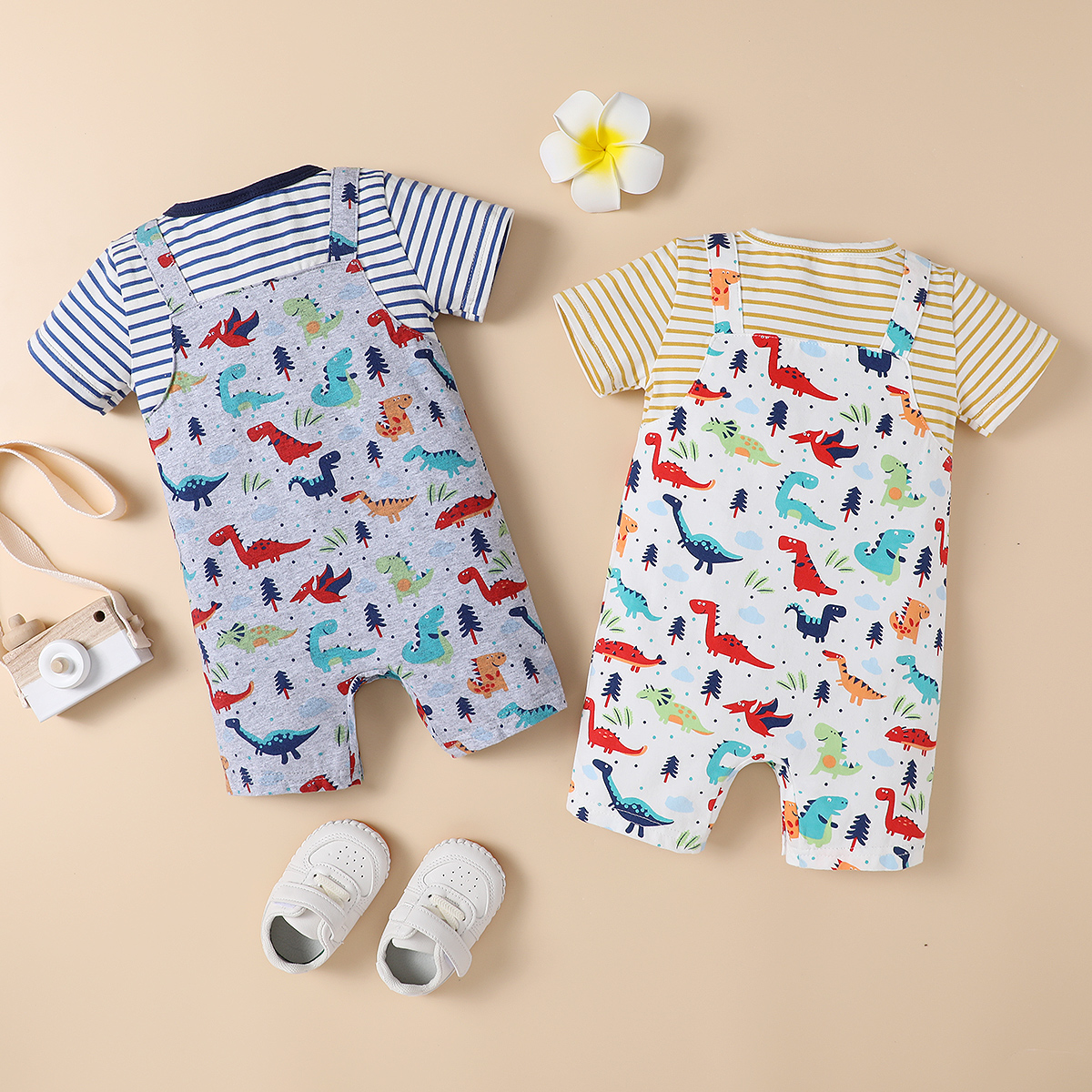 hibobi Boy Baby Dinosaur Print Patchwork Stripes Bodysuits Wholesale